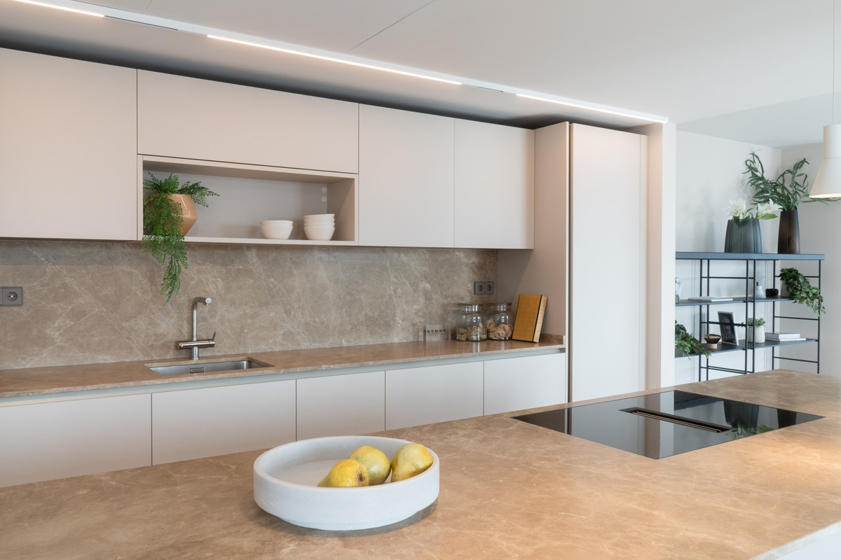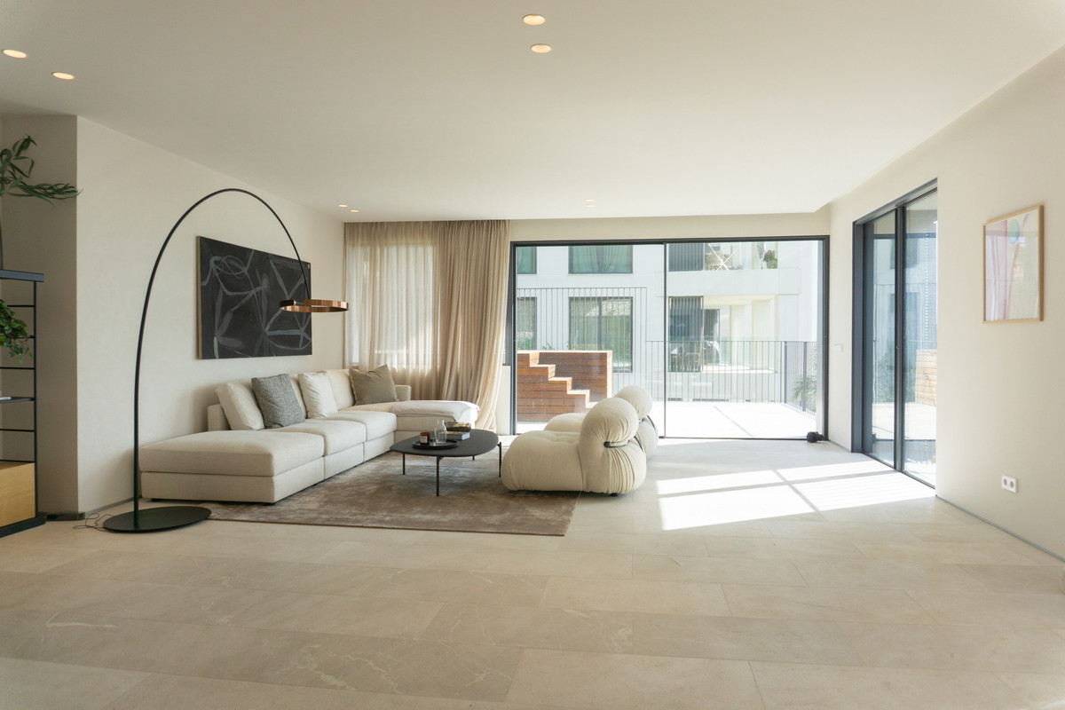 From the living room, sliding glass doors open onto the expansive terrace, where a heated pool, Mediterranean plantings, and porcelain tiles set the tone for relaxed outdoor living. This space is equally suited for quiet mornings and sunset gatherings. In keeping with the developer's focus on quality and lifestyle, the property includes private parking and advanced home automation systems, allowing residents to manage lighting, temperature, and security with ease.