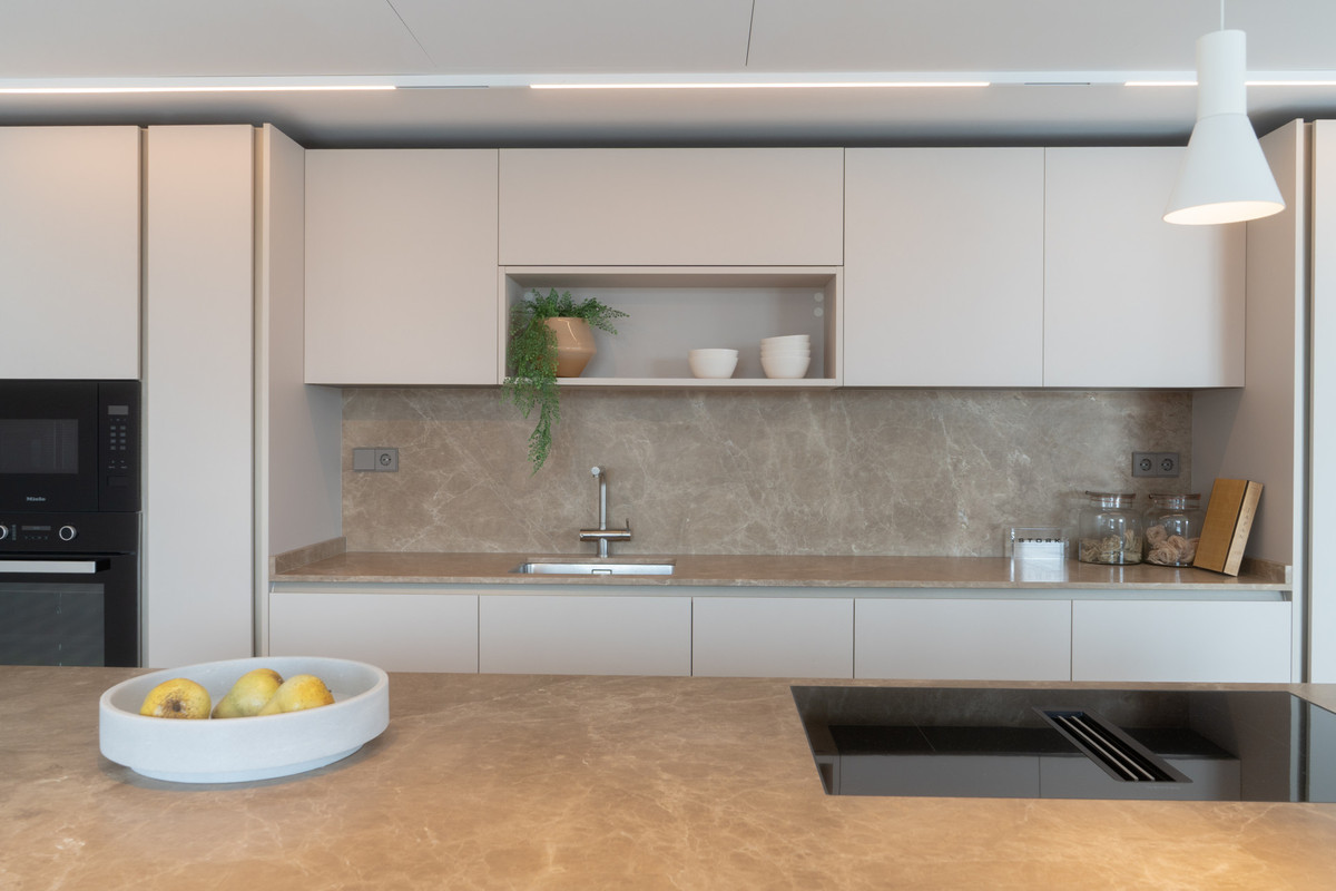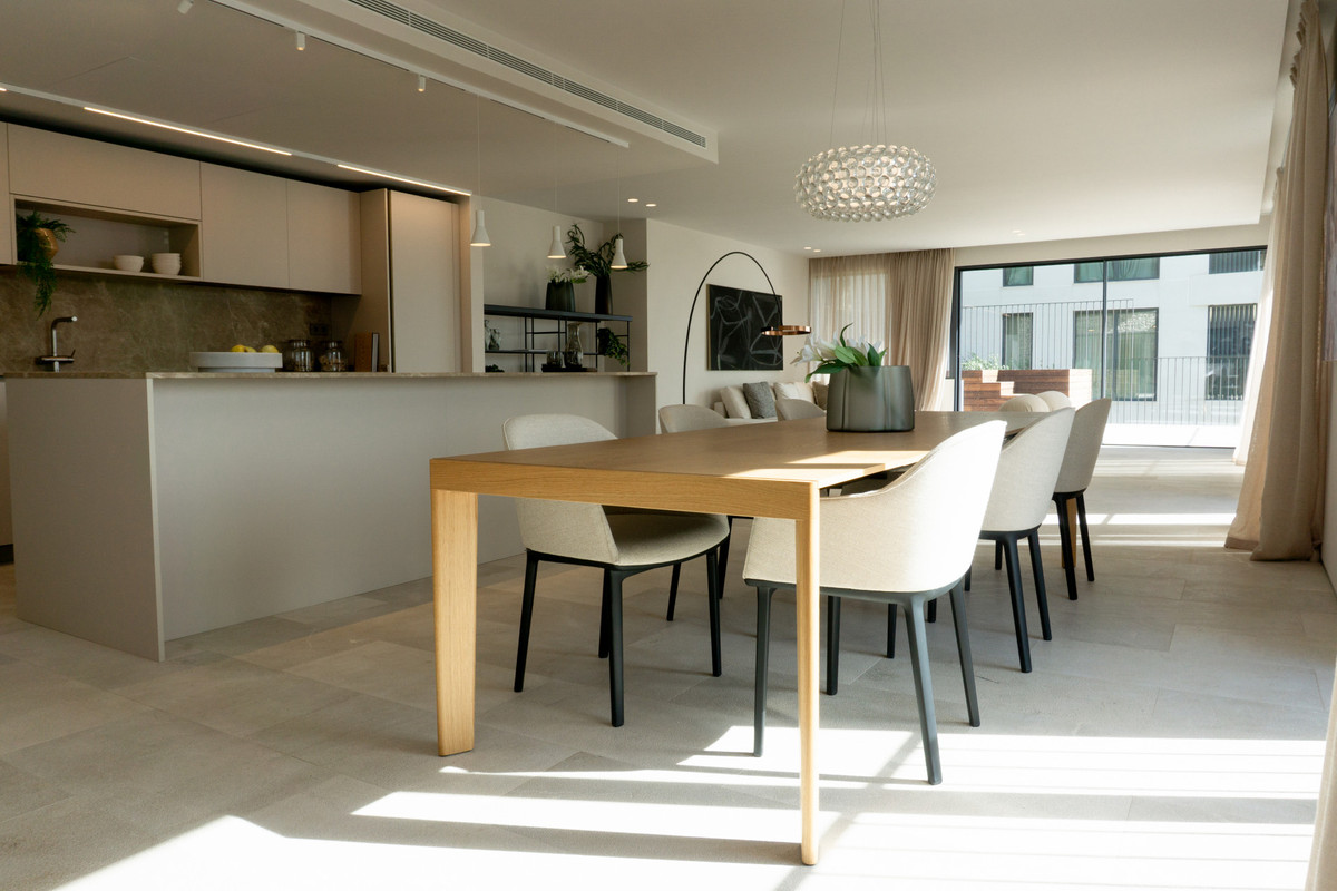 The main living area connects to a bespoke kitchen fitted with high-performance Miele appliances and custom Molteni & Dada cabinetry. A granite island serves as the centrepiece for both everyday living and entertaining. Bathrooms continue the modern design language, with microcement and marble finishes that elevate the experience. The integration of technology, including aerothermal heating, underfloor heating, and ceiling-mounted air conditioning, ensures optimal climate control all year round.