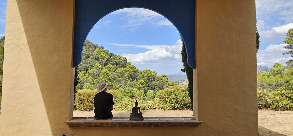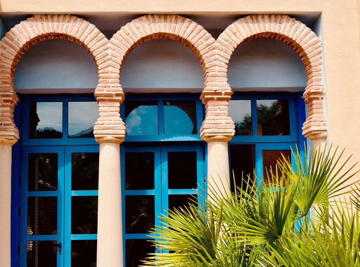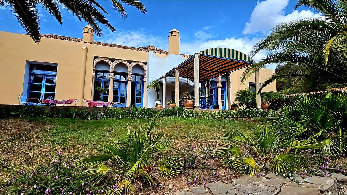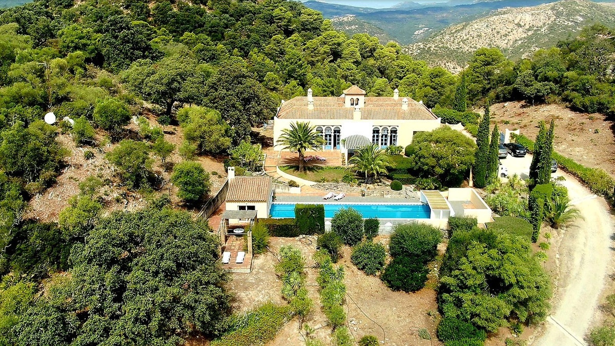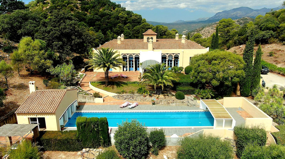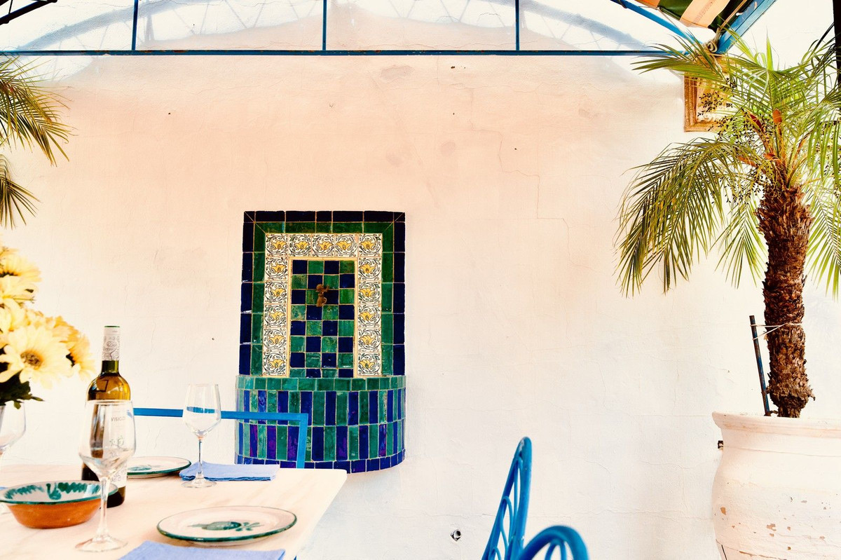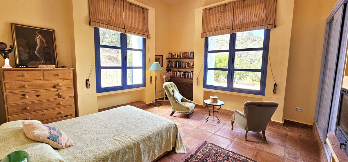 Access to the property is via a short dirt road that leads to a private electric gate, shared with just four other properties. As you ascend to the mountaintop, you'll be greeted by an imposing antique wooden door that ushers you into a grand entry hall. To the left and right, you'll find two en-suite guest bedrooms. Straight ahead, the magnificent living room beckons, cleverly divided into distinct areas by elegant pillars—an inviting lounge area with a generous fireplace, a dining area adjacent to the well-appointed kitchen, and a cozy music or study nook. French doors open seamlessly to the terrace, providing unobstructed views of the surrounding landscape and mountains. When all the doors are open, the distinction between indoor and outdoor living fades, allowing you to fully savor the Andalusian outdoor lifestyle.