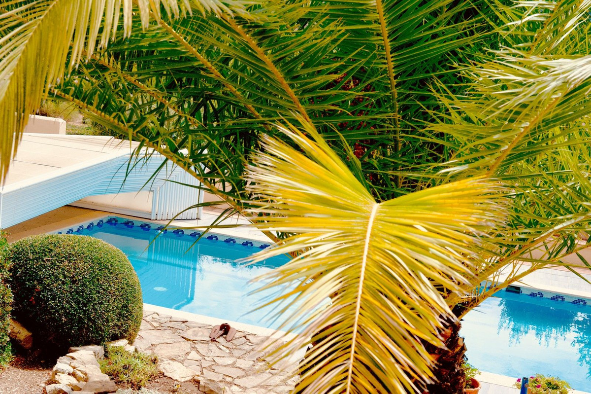 Surrounded by a rustic landscaped garden featuring palm trees and cypresses, the main house connects seamlessly with the pool area via a large terrace. Wide steps and a ramp lead down to the impressive 20x5m pool, which can be covered by a retractable greenhouse-type roof and heated for year-round enjoyment. The pool area is adorned with sunbathing terraces and vibrant flowers. A pool house with a shower, which could also double as a gym, completes the outdoor oasis.