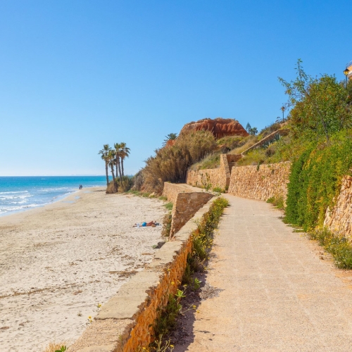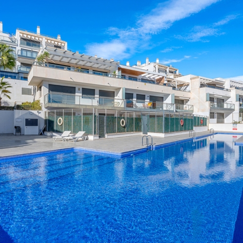 This spacious and bright apartment is located in the exclusive Aguamarina residential complex, Punta Glea, on the beachfront, with direct access to the seafront promenade. Located on the first floor, it faces southeast to enjoy the sun almost all day long. With a surface area of 78 m2, it has a very convenient layout, offering comfort and functionality.~The apartment has two large bedrooms, each with built-in wardrobes, providing plenty of storage space, and two full bathrooms.~The separate kitchen is fully equipped and includes a laundry room. A bright living-dining room and a large terrace, accessible from the living room and the master bedroom, are the perfect place to enjoy views of the complex's gardens and the sea. The apartment is sold partially furnished and has ducted air conditioning. The apartment also comes with a parking space in the underground garage.~The residential complex has a spectacular swimming pool, surrounded by gardens, ideal for enjoying sunny days and relaxing just steps from the sea. An unbeatable location, with the convenience of being right on the beach and with all amenities within walking distance.~