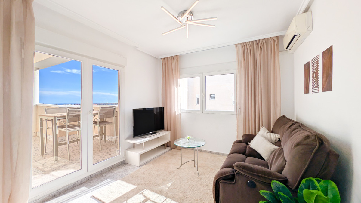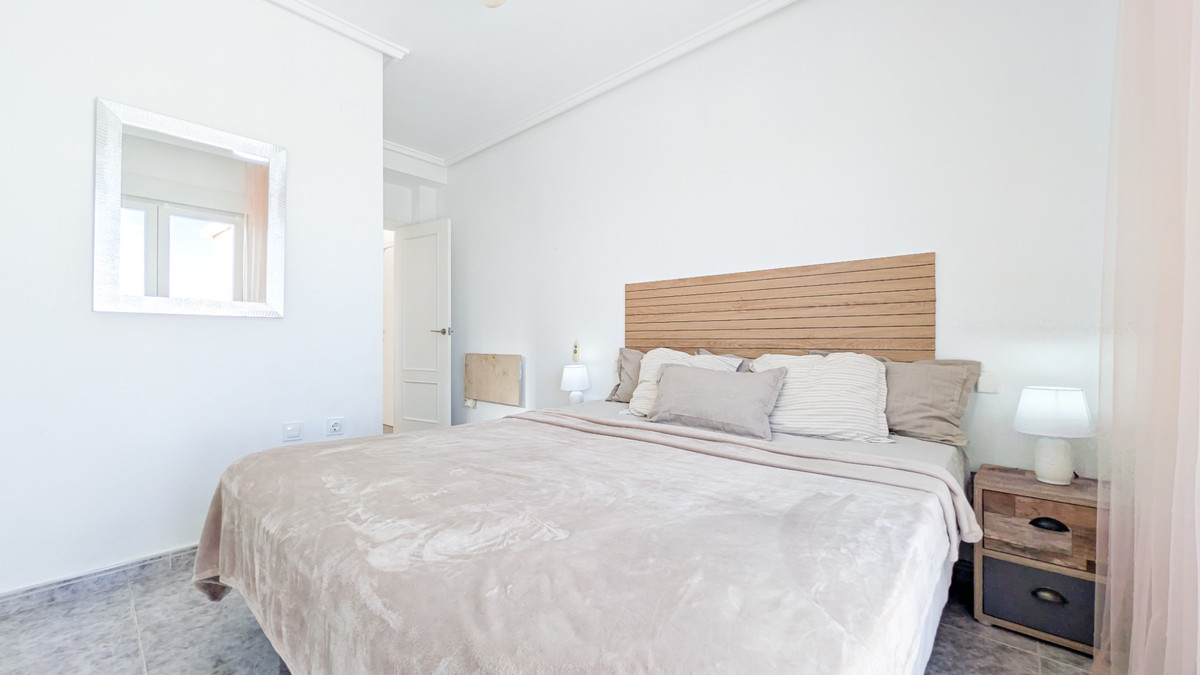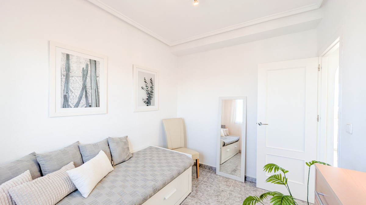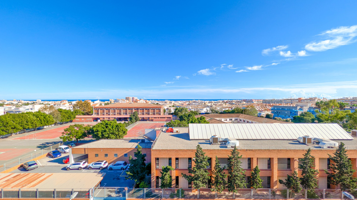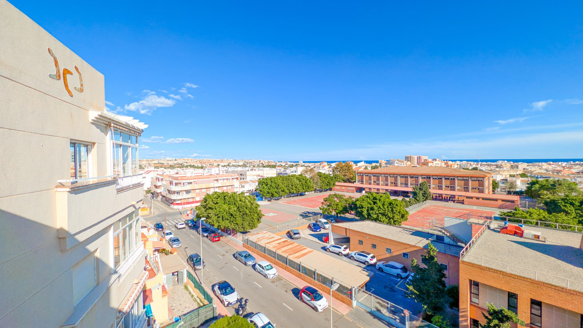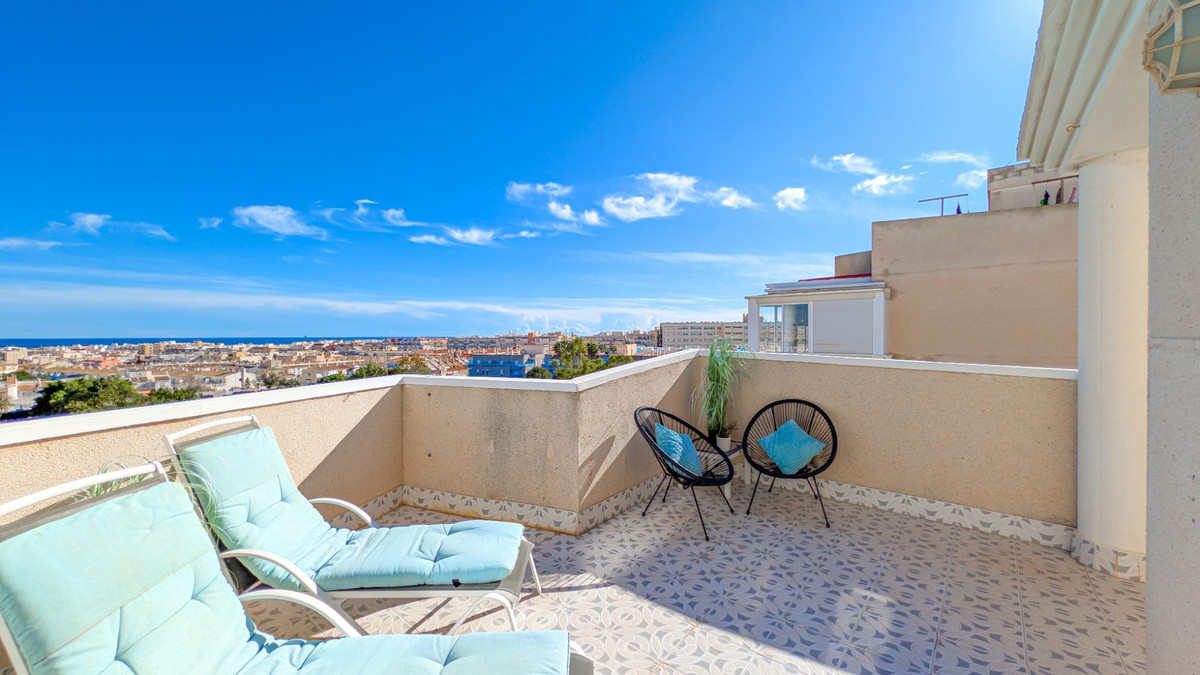 In Nueva Torrevieja, you will find this penthouse with views over the city of Torrevieja and the sea in the distance. With three bedrooms, it is a true gem at the top of the building, featuring a large private terrace on the same floor where you can sunbathe, enjoy meals, watch the sunrise over the sea, or simply spend time with family and friends. The terrace faces southeast, making it ideal for year-round living. During warm periods, you can use the outdoor shower on the terrace to cool off. On the south side, there is a smaller balcony where you can enjoy your afternoon coffee.