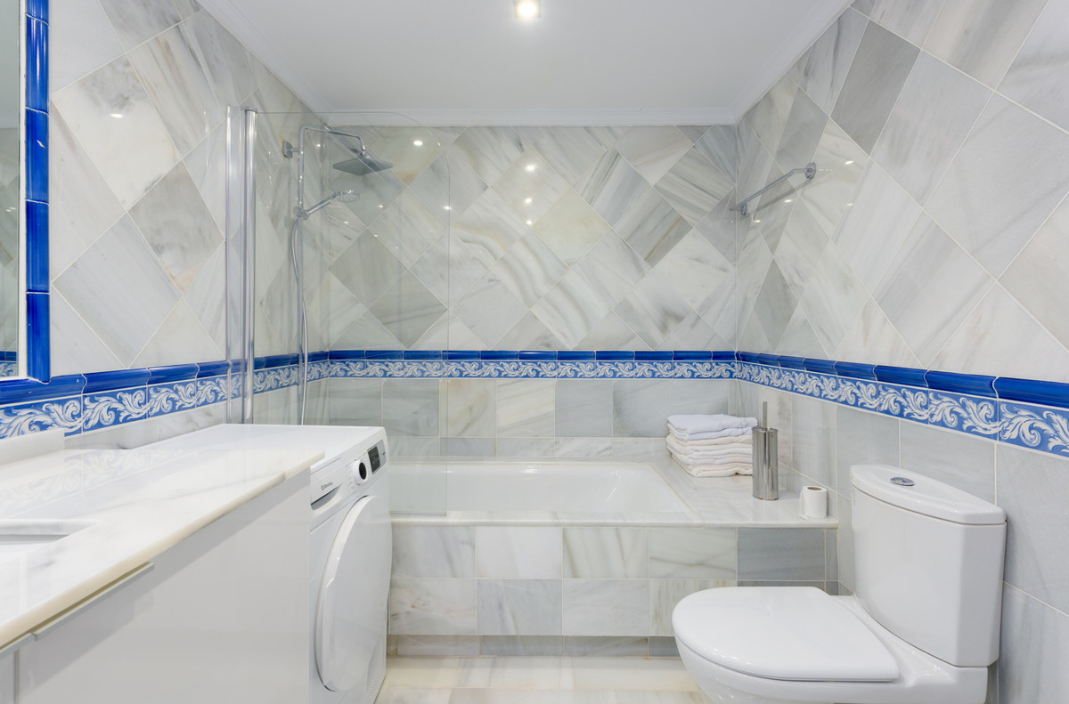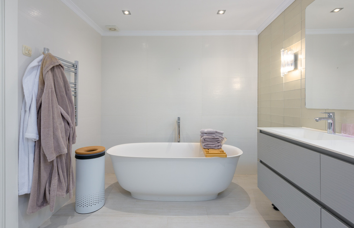 The master suite offers direct sea views and features a luxurious en-suite bathroom with a sunken bathtub, separate shower, and double vanity. The guest bedroom is also en-suite, and both bathrooms benefit from underfloor heating for added comfort.