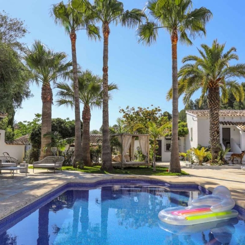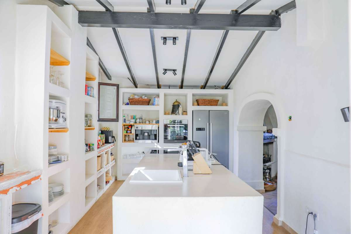 Exquisite Country Finca for Sale in the Heart of Jesús PobreWe are proud to present this stunning country finca, beautifully located in one of the most prestigious areas of Jesús Pobre. Meticulously renovated, this exceptional property offers a rare opportunity for those seeking a peaceful and private retreat—without compromising on the convenience of nearby amenities.Set on a completely flat plot, the home spans two spacious levels. The ground floor features a designer kitchen with a striking central island, perfect for enjoying culinary moments with family and friends. An elegant dining room with a fireplace creates a warm and inviting ambiance, while a hallway leads to a versatile space currently used as an office, which can easily be converted into an additional bedroom. A generous living room, bathed in natural light from large windows, invites you to relax and unwind.A graceful staircase leads to the upper floor, where you'll find the luxurious master suite complete with a dressing room and ensuite bathroom. From here, step out onto your private terrace and take in the breathtaking panoramic views of the majestic Montgó mountain.Complementing the main residence are two independent guest apartments, each offering two bedrooms and a full bathroom—ensuring privacy and comfort for your guests. A spacious laundry room adds to the property's functionality.The exterior of the estate is a true oasis. Expansive terraces, a large swimming pool, and chill-out areas create the perfect setting for outdoor living. A fully equipped summer kitchen is ideal for entertaining and hosting alfresco gatherings. A sauna is currently under construction and will soon enhance the wellness offering of this magnificent home.Additional features include split air conditioning throughout the property, ample parking, and a garage with space for three vehicles.If you're in search of a tranquil and distinguished sanctuary, this exceptional finca could be your perfect match. We warmly invite you to schedule a visit and experience the charm and exclusivity of this unique property firsthand.