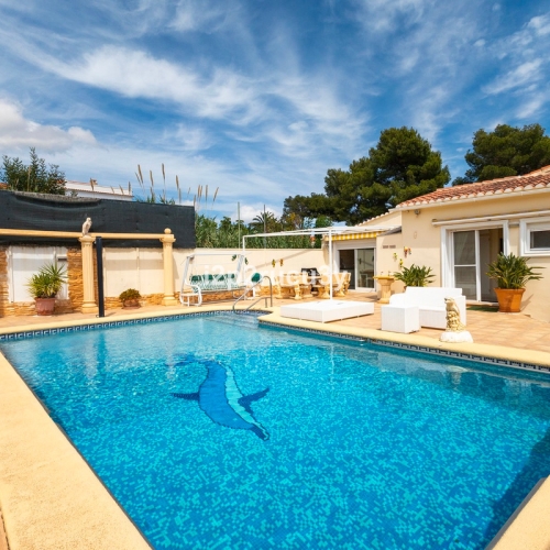 Dream Villa Above El Portet Bay, Moraira – Stunning Views & Top EquipmentSituated in one of Moraira's most sought-after locations, this spacious Spanish-style villa lies just 900 meters above the picturesque El Portet Bay. From here, you can enjoy breathtaking sea views, peaceful surroundings, and easy access to the beach, local restaurants, shops, and the charming town center of Moraira (approx. 2 km away).Key Facts:Living space: approx. 373 m²Plot size: approx. 836 m²Bedrooms: 4 – each with en-suite bathroom and air conditioningBathrooms: 4Private Pool: 9 x 4 m with sea views and outdoor showerAccommodates: up to 8 people Outdoor Areas:Covered dining terrace with large wooden table for 8 peopleSpacious sun terrace with loungers, Bose outdoor sound system, and shaded lounge areaInfinity sea and mountain views from multiple levelsPrivate pool with Roman steps and underwater lightingBasketball hoop, table tennis, pull-up bar – perfect for families and active guestsLandscaped garden with trees and hedges, bordering a green zoneCarport for 2 cars, plus additional parking on the gated property with electric entrance gateFeatures & Highlights:Bright, open living and dining area with sea view and direct access to terraceUnderfloor heating, double-glazed windows, electric shuttersPhotovoltaic solar system for cost-efficient energy during the dayAir conditioning in the living/dining area and all bedroomsModern American kitchen fully equipped with Bosch appliances (ceramic cooktop, oven, dishwasher, microwave, coffee machine, toaster, etc.)Elegant cream marble floors throughout the entire house4 stylish bedrooms, each with en-suite bathroom, TV, mosquito screens, and A/CMaster bedroom with large private balcony and panoramic views of the sea and Sierra Bernia mountainsWine cellar (Bodega) in the basement – perfect for wine loversPrivate cinema room with 85-inch TV – ideal for movie nights or gaming sessionsThis villa combines luxury, comfort, and one of the best locations on the Costa Blanca. Whether for personal use, as a holiday retreat, or as a high-end rental property – this home ticks all the boxes.