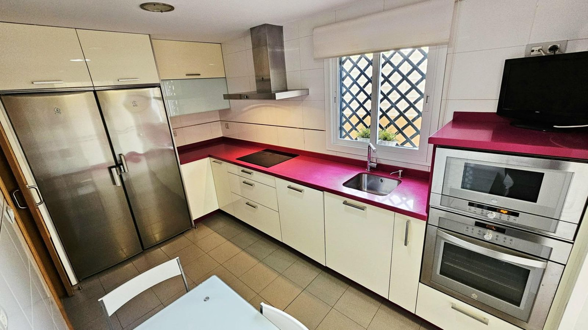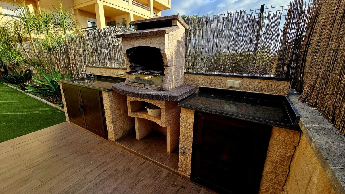 This beautiful two-bedroom ground-floor apartment boasts a spacious outdoor area. It features a large covered terrace and a spacious private garden with a barbecue, pergola, and direct access to the swimming pool, paddle tennis court, and children's playground.