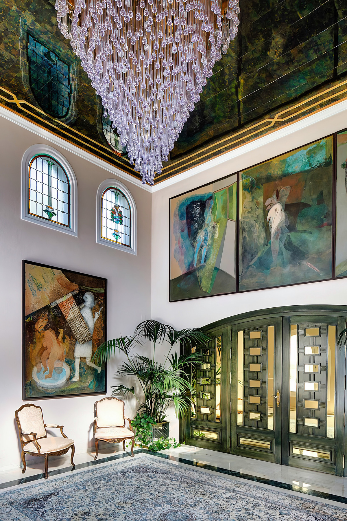 The ground floor houses the main living and reception areas, with spacious lounges and a formal dining room arranged around a central patio with a fountain, which floods the interior spaces with light and freshness.