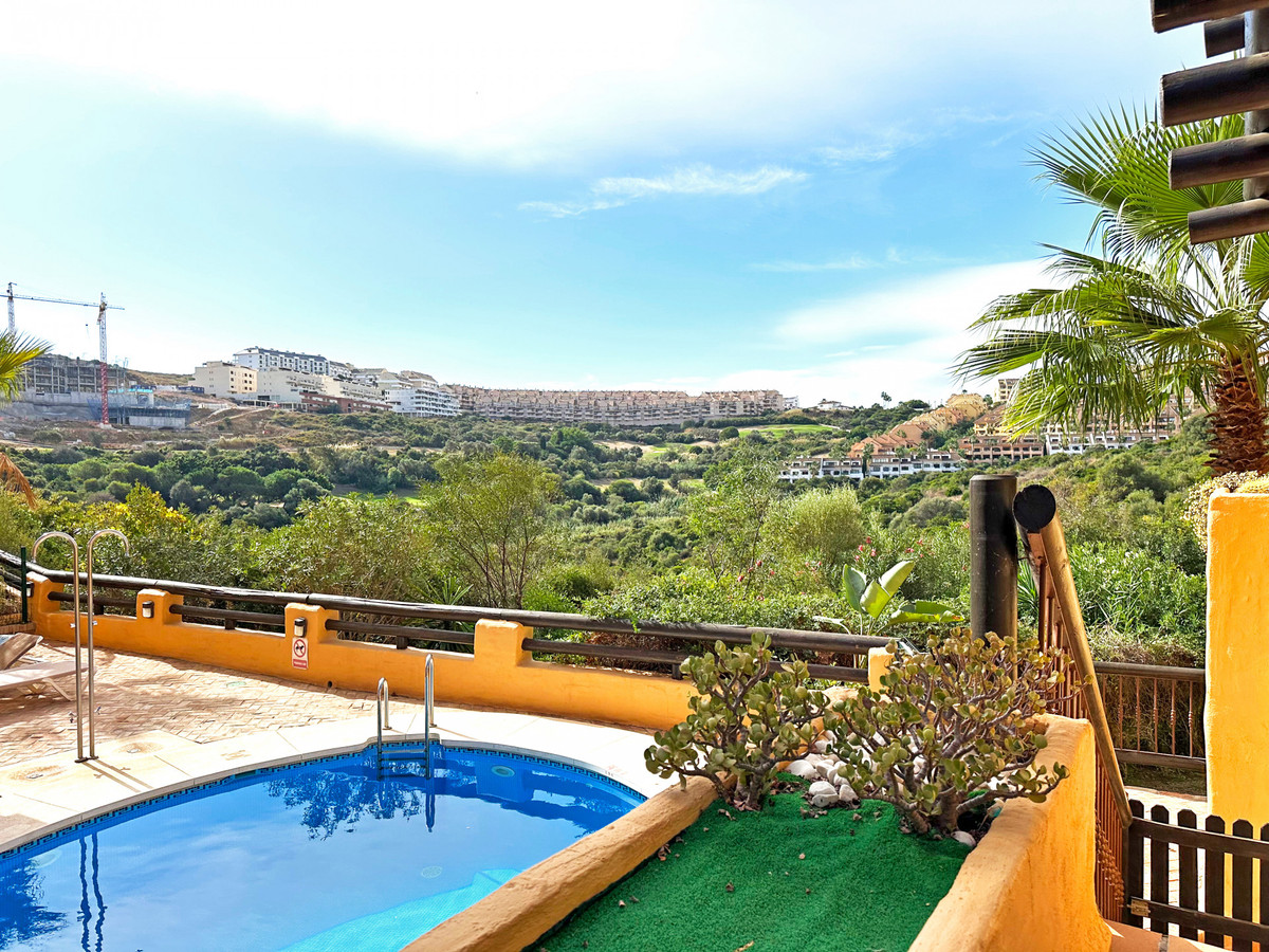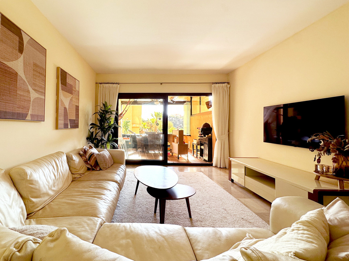 The spacious living room opens onto a Lumon glazed terrace, where you can relax and enjoy pleasant views of the pool and golf course throughout all seasons.