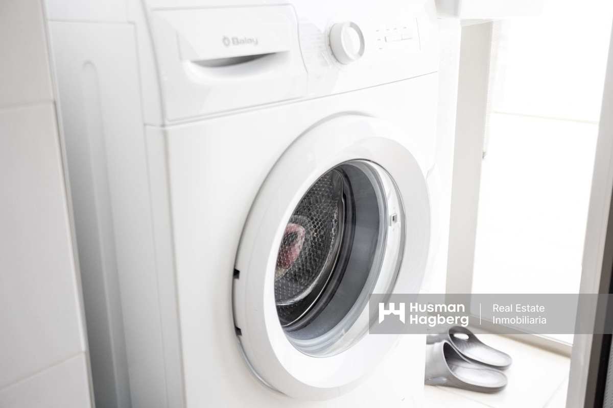 The home is located on the second floor of a stylish building with an elevator, and offers two spacious bedrooms and two fully tiled bathrooms with underfloor heating – a luxury that makes a big difference all year round. The open floor plan creates an airy flow between the fully equipped kitchen and the inviting living room, where large windows let in the warm, Spanish light.