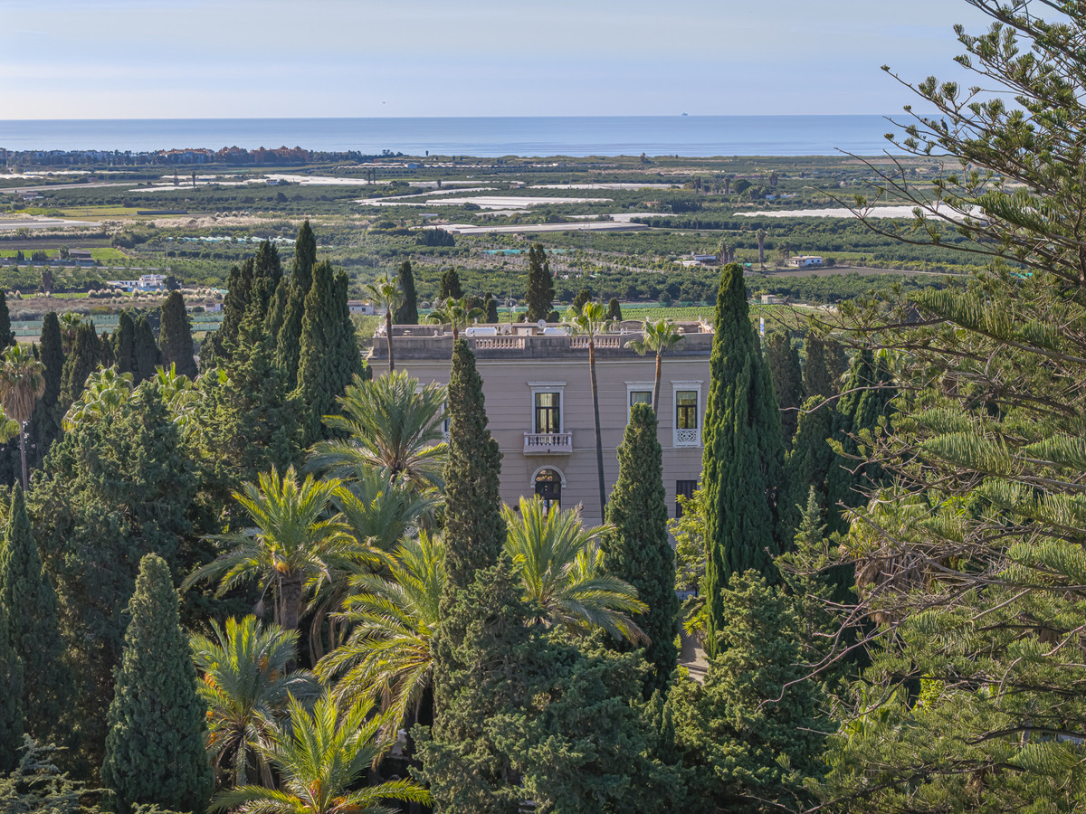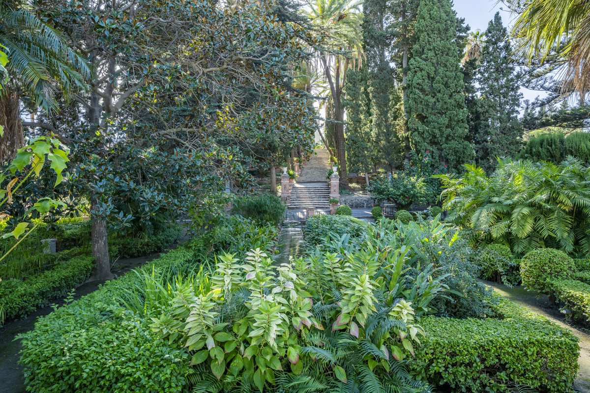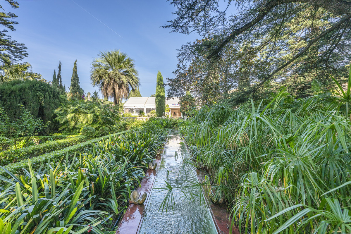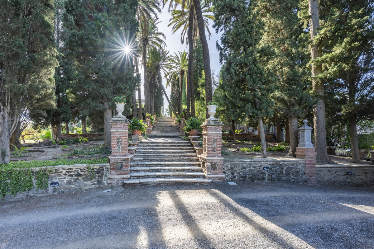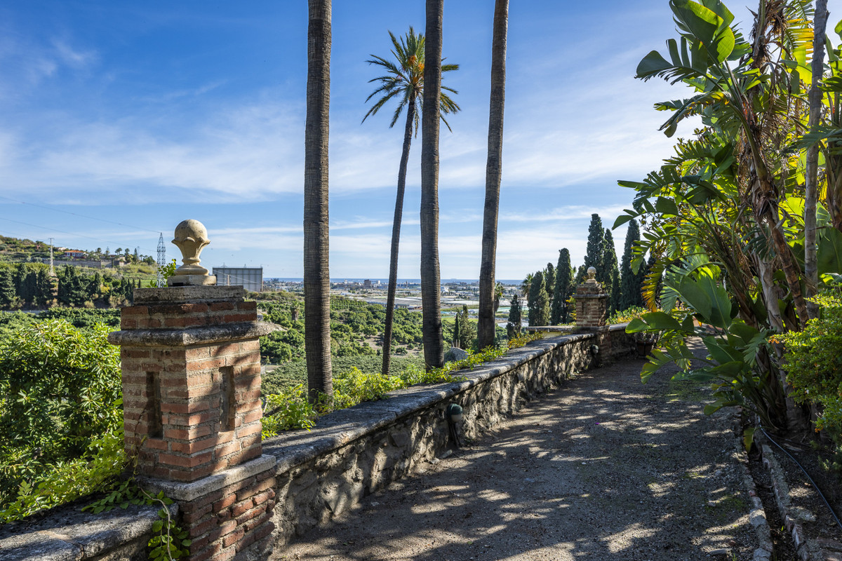The property retains original architectural details throughout, including marble staircases and period features that reflect its Italian influences. Two botanical gardens frame the house: an 18th-century garden inspired by Granada's Generalife and a 19th-century romantic winter garden. A 40-step marble staircase connects both levels, culminating in two coral grottoes. The grounds shelter araucarias, magnolias, cypresses, a Lebanese cedar, and multiple palm varieties, including kentias, washingtonias, date palms and butia capitata. Seven fountains, some over 200 years old, punctuate the pathways. A rose garden adds seasonal colour. The orchards produce avocados, mangoes, persimmons, guavas, bananas, cherimoyas and oranges. A 13th-century Arab watchtower and wall stand on the property, alongside two Moorish aqueducts that once supplied the estate.