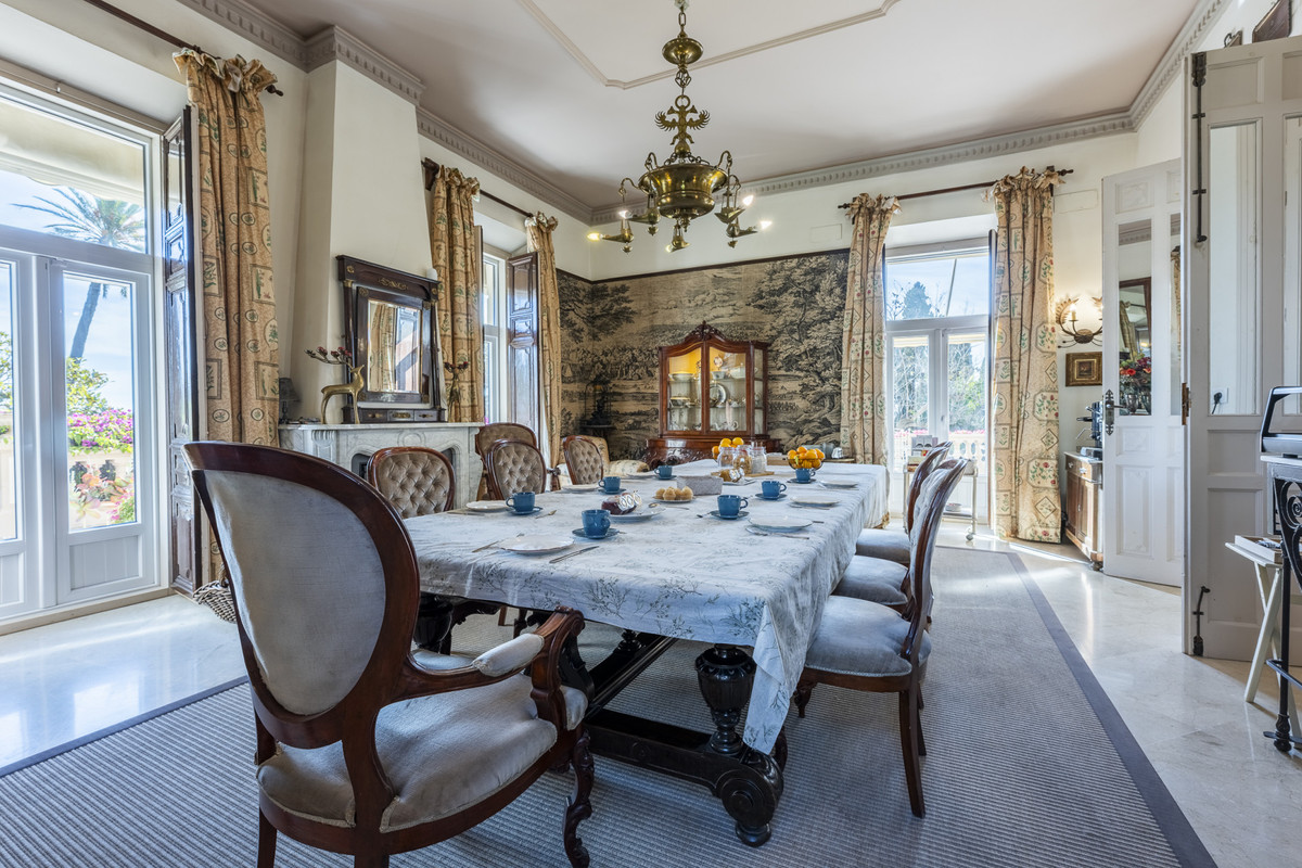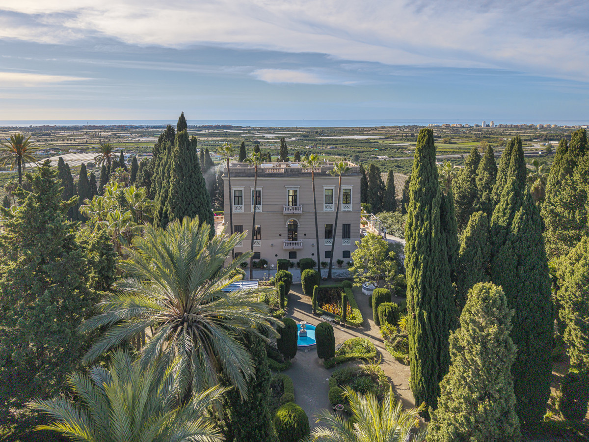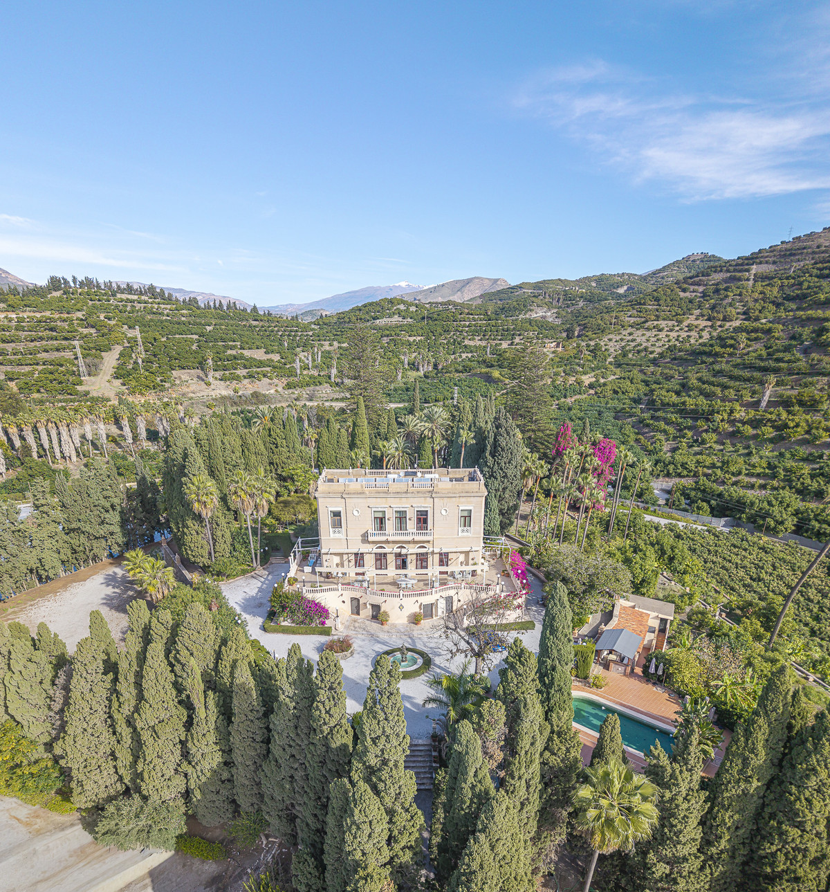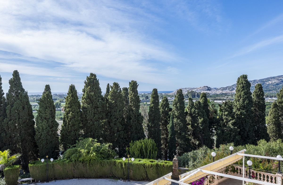 The property retains original architectural details throughout, including marble staircases and period features that reflect its Italian influences. Two botanical gardens frame the house: an 18th-century garden inspired by Granada's Generalife and a 19th-century romantic winter garden. A 40-step marble staircase connects both levels, culminating in two coral grottoes. The grounds shelter araucarias, magnolias, cypresses, a Lebanese cedar, and multiple palm varieties, including kentias, washingtonias, date palms and butia capitata. Seven fountains, some over 200 years old, punctuate the pathways. A rose garden adds seasonal colour. The orchards produce avocados, mangoes, persimmons, guavas, bananas, cherimoyas and oranges. A 13th-century Arab watchtower and wall stand on the property, alongside two Moorish aqueducts that once supplied the estate.