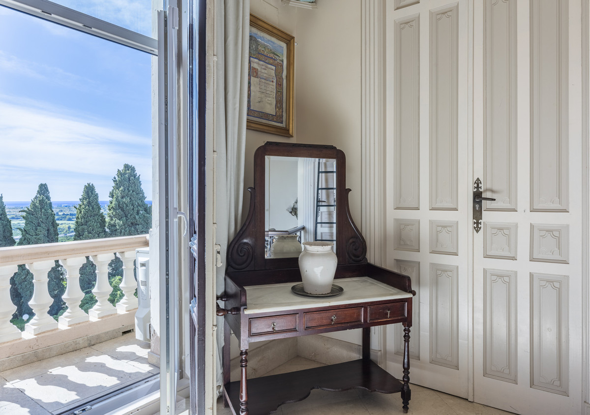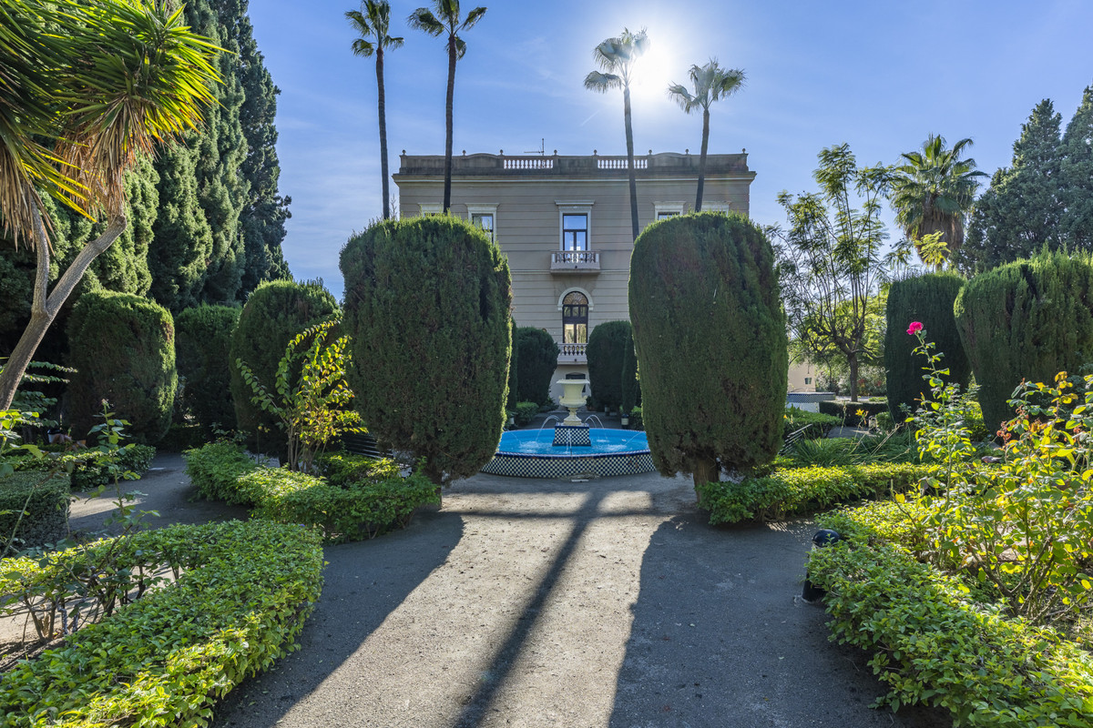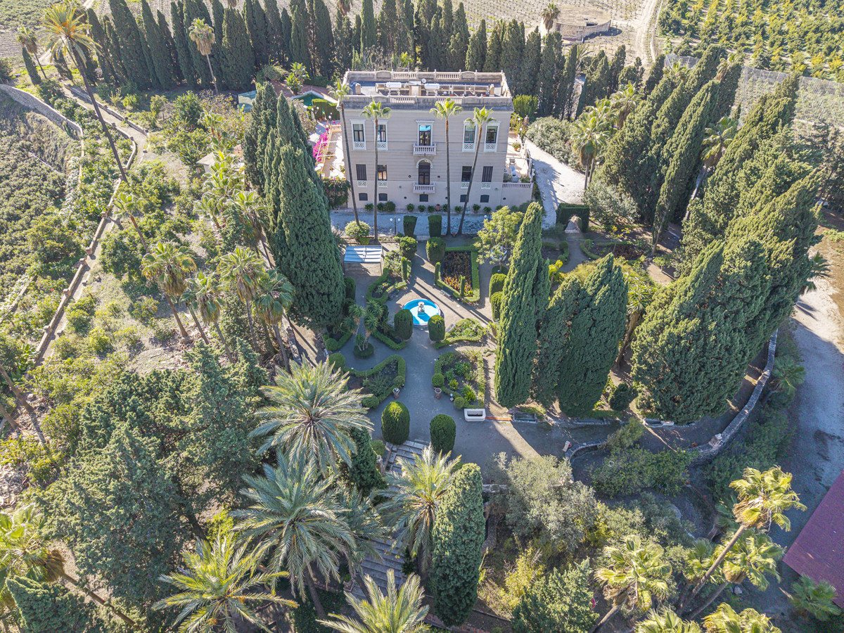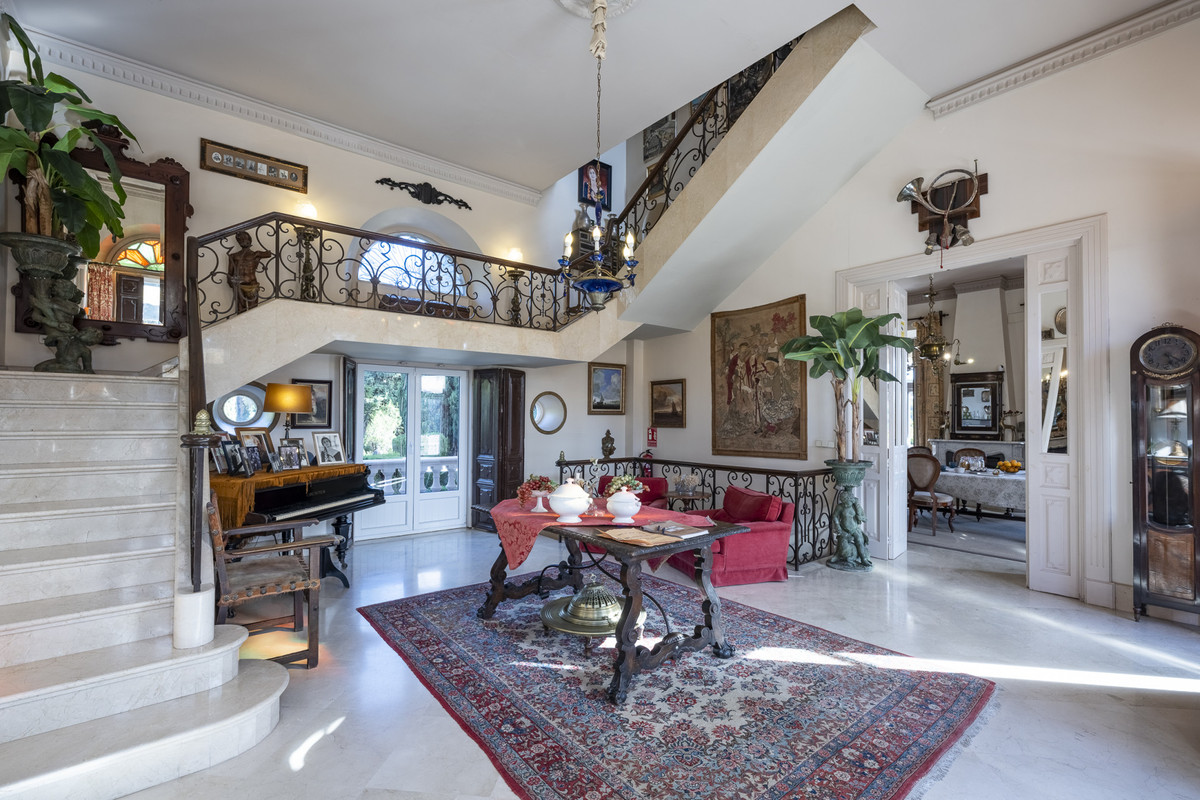 The property retains original architectural details throughout, including marble staircases and period features that reflect its Italian influences. Two botanical gardens frame the house: an 18th-century garden inspired by Granada's Generalife and a 19th-century romantic winter garden. A 40-step marble staircase connects both levels, culminating in two coral grottoes. The grounds shelter araucarias, magnolias, cypresses, a Lebanese cedar, and multiple palm varieties, including kentias, washingtonias, date palms and butia capitata. Seven fountains, some over 200 years old, punctuate the pathways. A rose garden adds seasonal colour. The orchards produce avocados, mangoes, persimmons, guavas, bananas, cherimoyas and oranges. A 13th-century Arab watchtower and wall stand on the property, alongside two Moorish aqueducts that once supplied the estate.