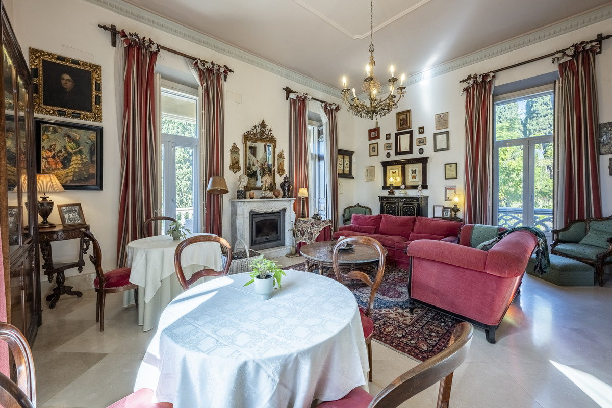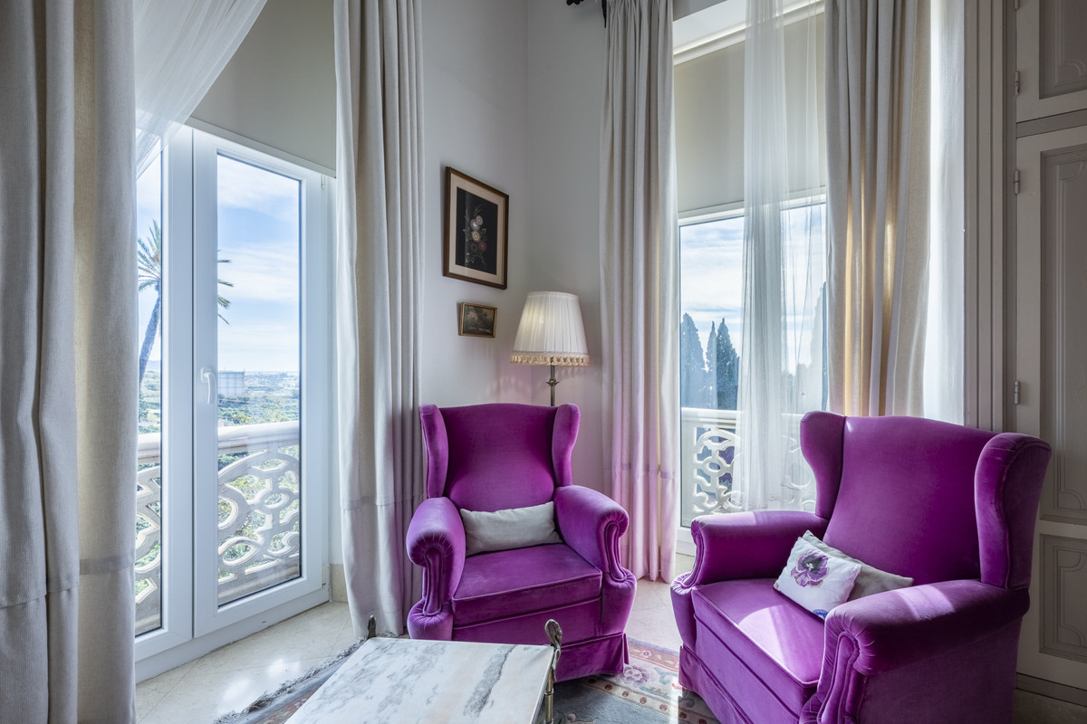 The main palazzo spans 660 sqm across multiple levels and accommodates eight bedrooms, each with its own bathroom. The Eugenia Suite and Habana Junior Suite lead the accommodation, whilst six double rooms named after garden plants (Magnolia, Hierbabuena, Eucalipto, Ibiscus and Buganvilla) offer garden views and individual character. Reception rooms include a library with a fireplace, a formal dining room with a fireplace, and a sitting room, all furnished with family pieces that create an intimate atmosphere rather than hotel anonymity. The 220 sqm terrace serves as an outdoor dining space where guests can breakfast amongst the tropical gardens.