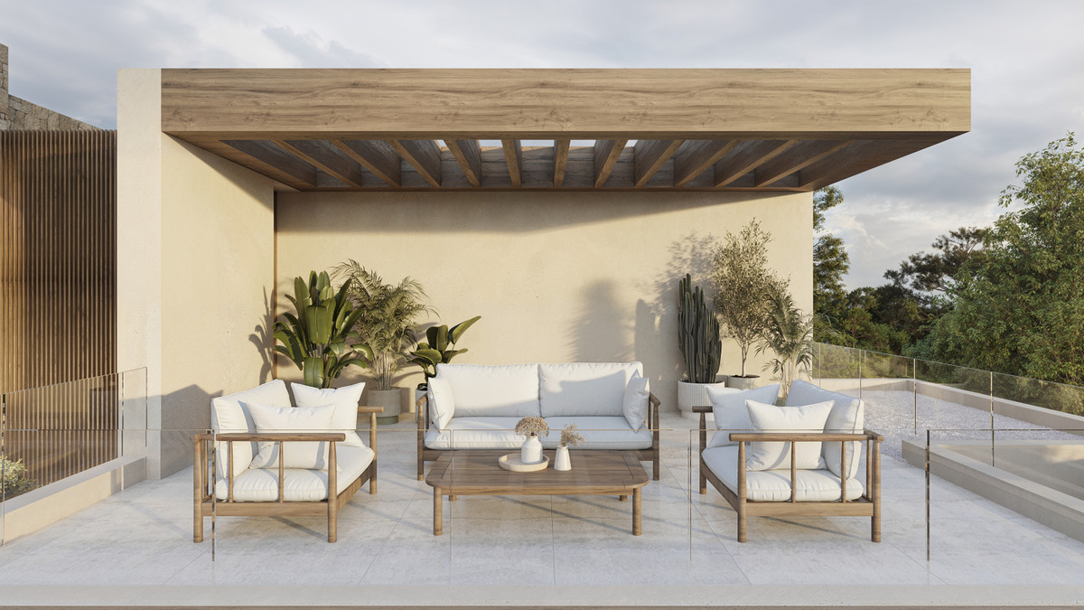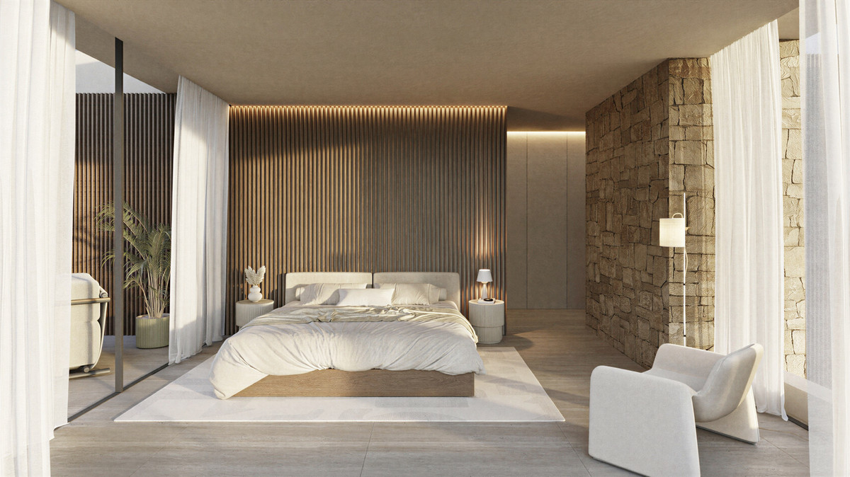 Enjoy panoramic sea views through floor-to-ceiling windows, seamless indoor-outdoor flow, and luxurious finishes in stone, wood, and soft neutral tones. Outdoor living is elevated with an infinity pool, sun terraces, and a stylish covered dining area beneath a wooden pergola.