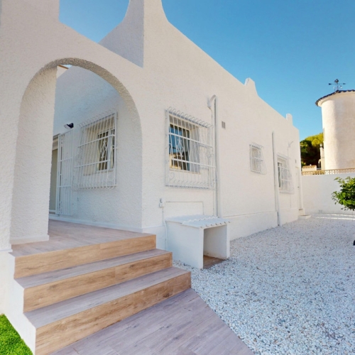 Take a look at this Fabulous Renovated Bungalow located in a quiet area of Blue Lagoon, Villamartin. The property consists of 2 bedrooms, 1 bathroom, living/dining area and a fully fitted kitchen. The property benefits from being completely renovated throughout and offers a private garden, terraced areas, roof solarium and space to put a private pool if desired.