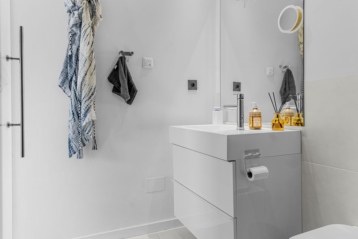 The home is spacious and offers three bedrooms as well as two stylish, fully tiled bathrooms with modern design. The open-plan kitchen blends seamlessly with the bright and airy living room, where large windows fill the space with natural light and lead out to a private balcony.