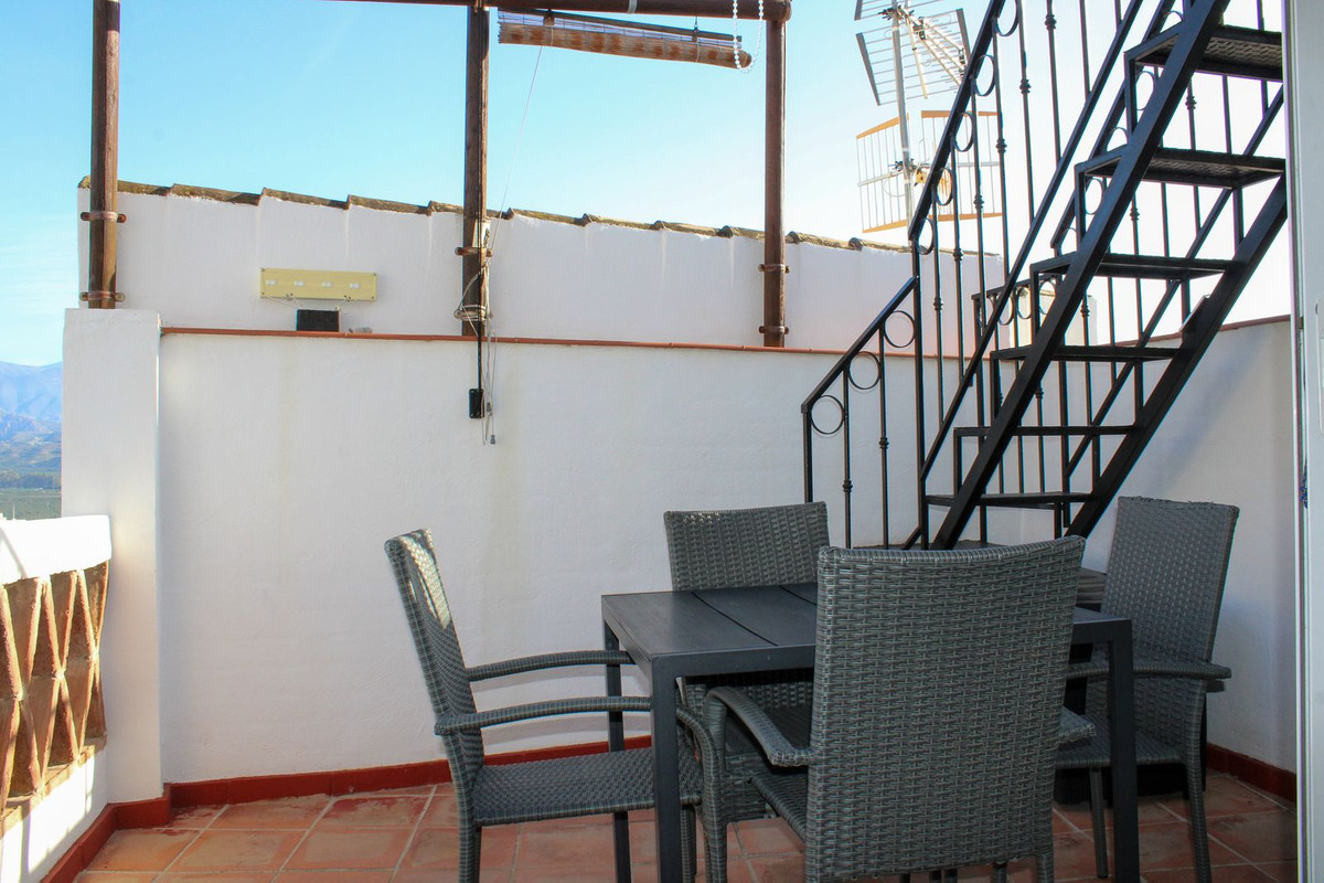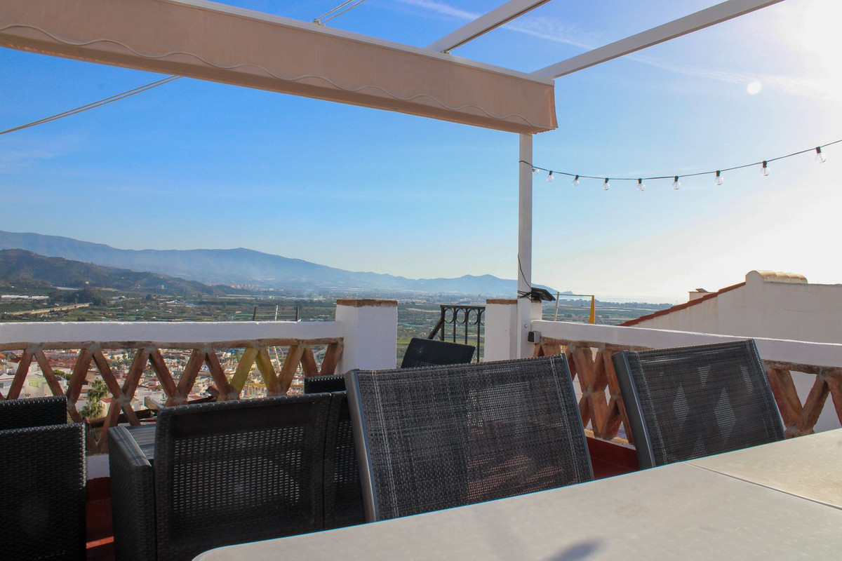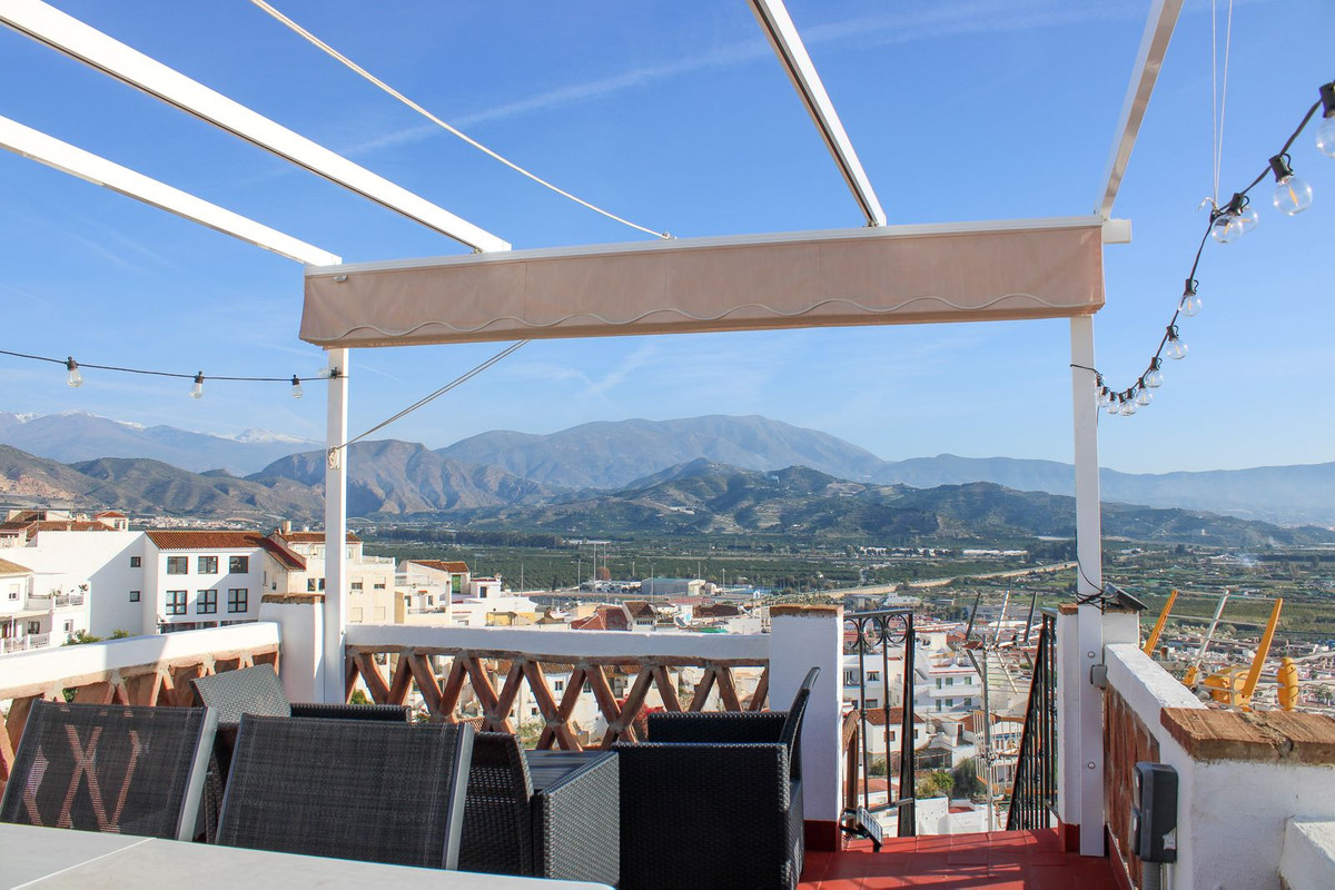 On the next floor you have a spacious fully equipped kitchen with dining area, with a terrace outside. We go up to the jewel in the crown, a wonderful roof terrace with pergola and awnings. Here you have a 360-degree view of Salobreña town, the castle, the church, the beautiful mountains of Sierra Nevada and the Mediterranean Sea. This house must be experienced on site, book a viewing with us today.