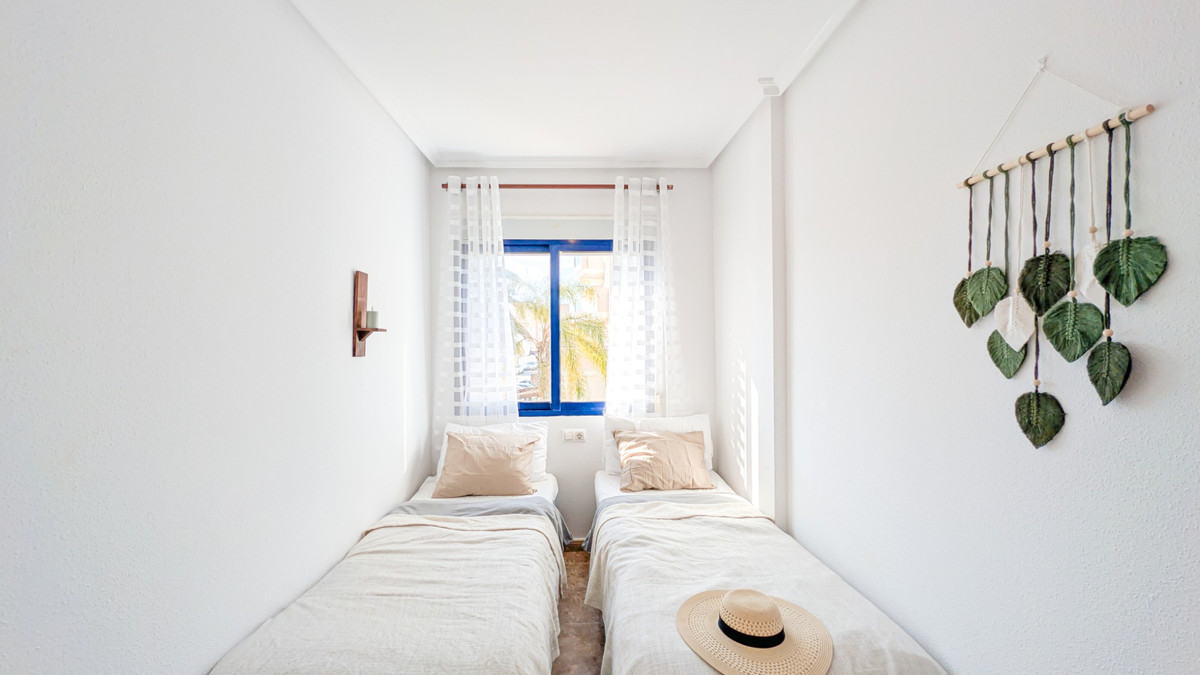 The second bedroom enjoys views over the pool area and also includes a wardrobe, making it ideal as a guest room or home office.