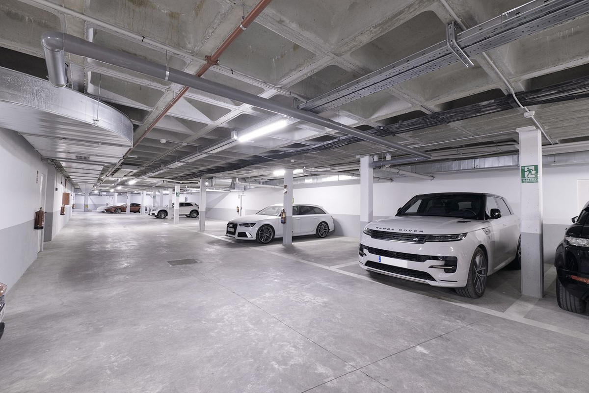 The apartment features individually controlled underfloor heating and air conditioning for year-round comfort. The bathrooms are well finished and practical, with a shower screen in the master bathroom and storage beneath the sinks. The underground parking space is pre-installed for an electric vehicle charging point.
