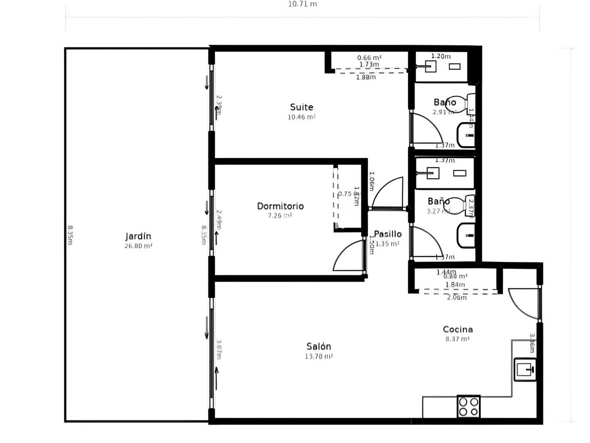 The apartment comprises two spacious bedrooms, including a master bedroom with private access to an en-suite bathroom. There are two modern, designer bathrooms finished to a high standard. Large windows provide plenty of natural light throughout the property, and all rooms enjoy direct access to the generous terrace, creating a seamless connection between indoor and outdoor living.