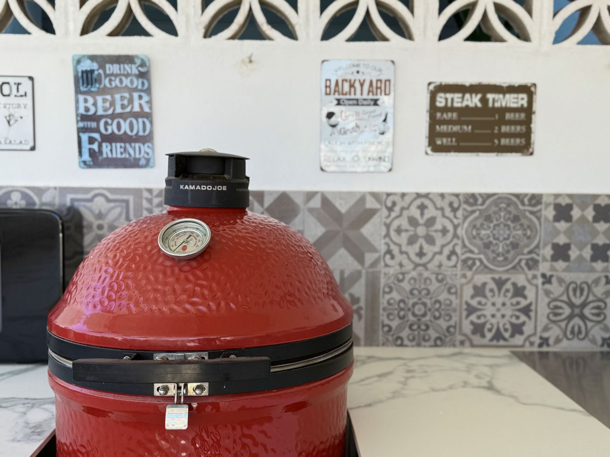 The 98 m² terrace, located on the same level as the apartment, extends the living space outdoors. It includes a fully equipped outdoor kitchen with barbecue, sink, and fridge, a dining area for six, a bar section, outdoor shower, and even a private gym. Part of the terrace is enclosed in glass and currently used as a home office with AC – which can also serve perfectly as an extra guest room.