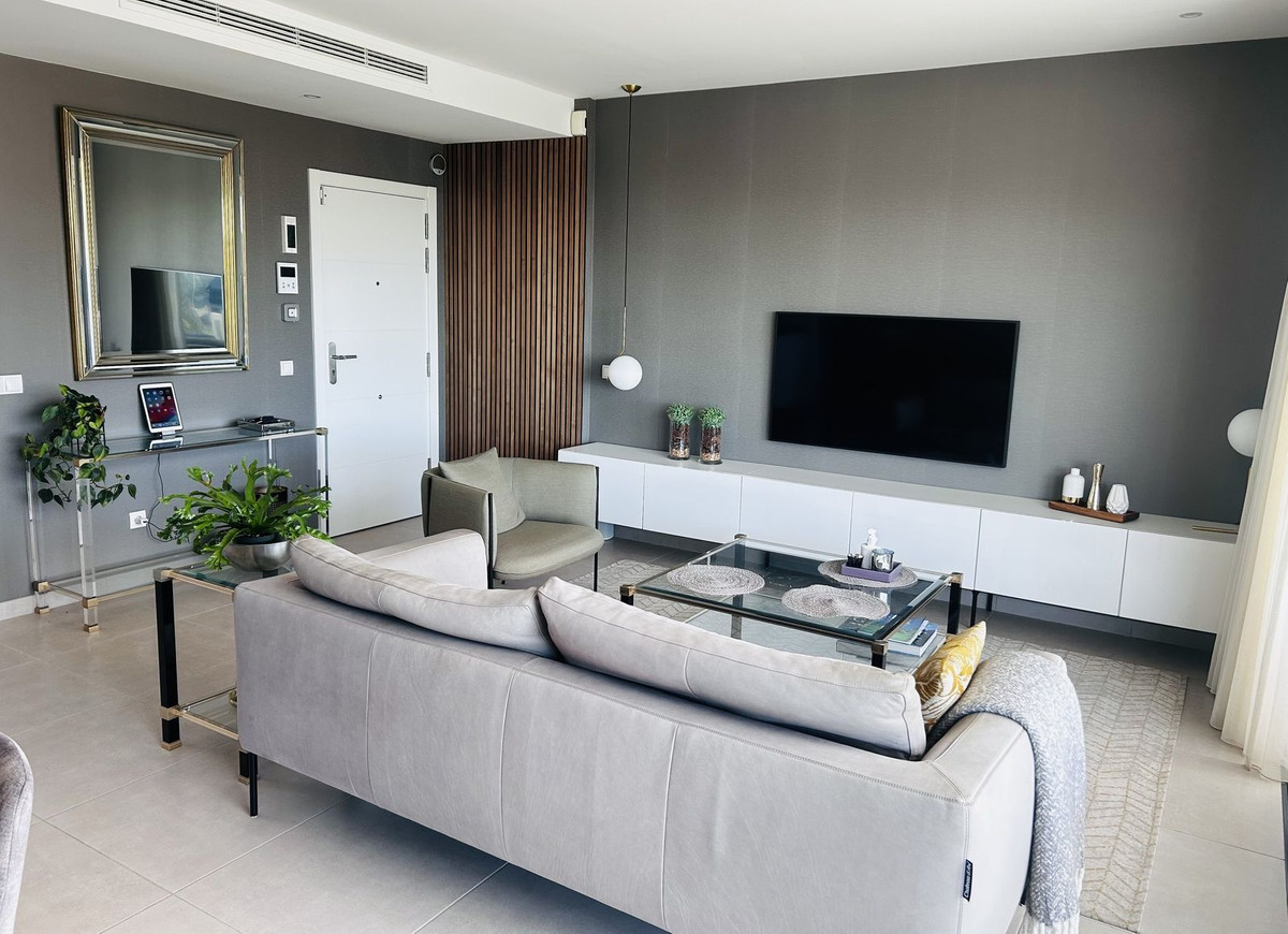 The penthouse is situated directly on the frontline of the famous "Campo America" golf course and offers breathtaking panoramic views of the mountains, golf courses and the Mediterranean Sea. It is distributed over 2 floors. On the main floor, the elegant living-dining area opens into a spacious terrace where sunrise become a masterpiece. The open-plan, fully equipped kitchen with Bosch electric appliances is designed for family meals and is complemented by practical utility cabinets. Two additional bedrooms offer comfort and privacy with a stunning view on the golf course and share the guest bathroom.