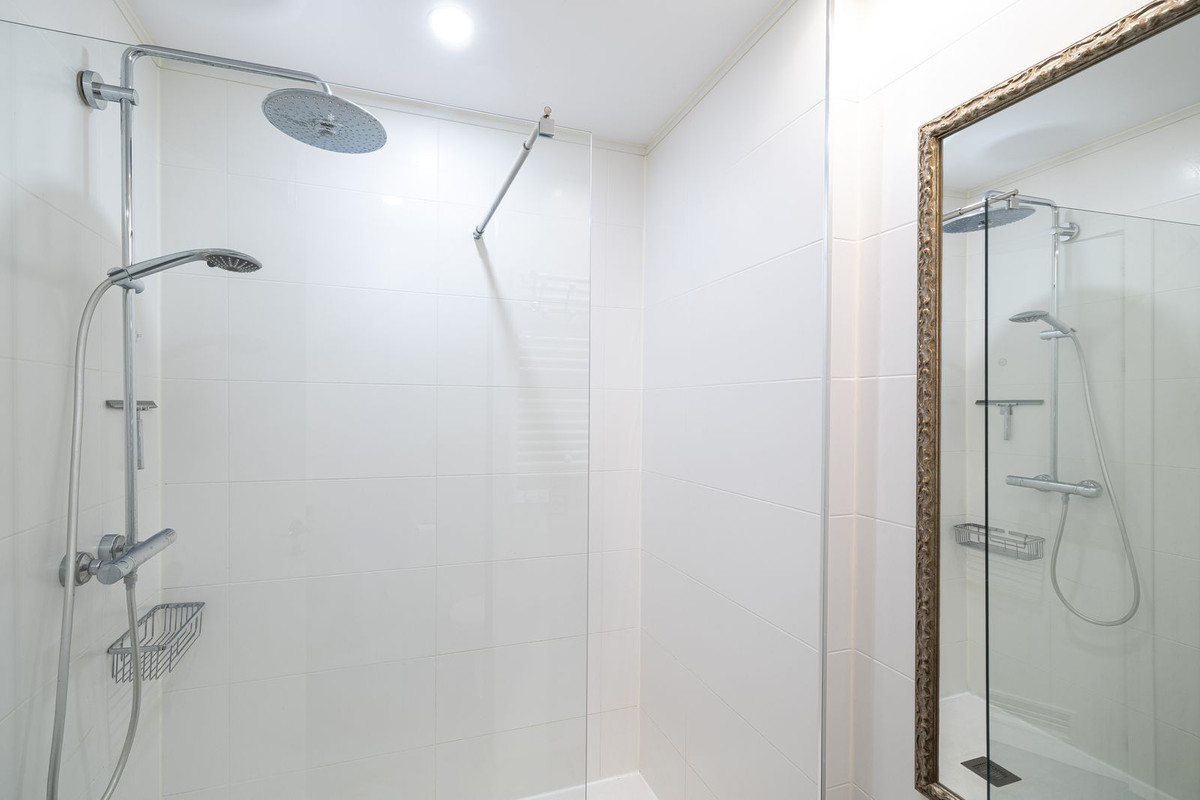 On the third floor, there is a large rooftop terrace that is partially covered and glass-enclosed. This space has been fitted with a second kitchen and is perfectly suited for use as a home office or an extra bedroom for guests. The terrace has plenty of room for both a lounge set and sun loungers, and it includes an outdoor shower for refreshing yourself. The rooftop is crowned by beautiful views of the Mediterranean, providing a heavenly oasis for enjoying the outdoor lifestyle.