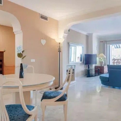 Situated in a highly convenient and sought-after location, this bright and beautifully presented ground floor garden apartment is within walking distance of a wide range of amenities and enjoys lovely views over the Mijas Golf course. The property offers two spacious bedrooms and two bathrooms, including a master suite with en-suite bathroom featuring both a bathtub and walk-in shower. The second bathroom is fitted with a shower. The master bedroom has a double bed, while the second bedroom offers twin beds. Both bedrooms are east-facing, allowing plenty of morning sunshine and direct access to a connecting terrace—perfect for enjoying your morning coffee.