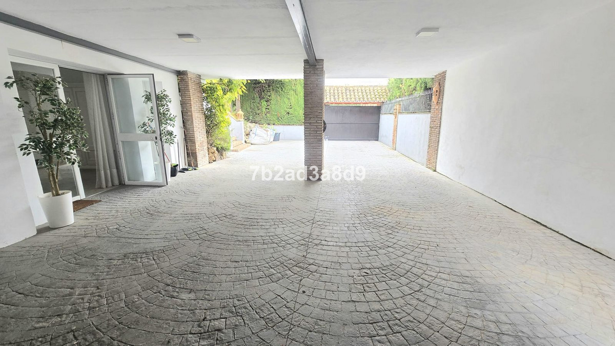 Outdoors, the villa boasts a heated swimming pool, perfect for year-round enjoyment of Marbella's exceptional climate. Parking is plentiful, with capacity for up to six vehicles, including a two-car garage, a covered carport for two cars, and two additional uncovered spaces within the plot.