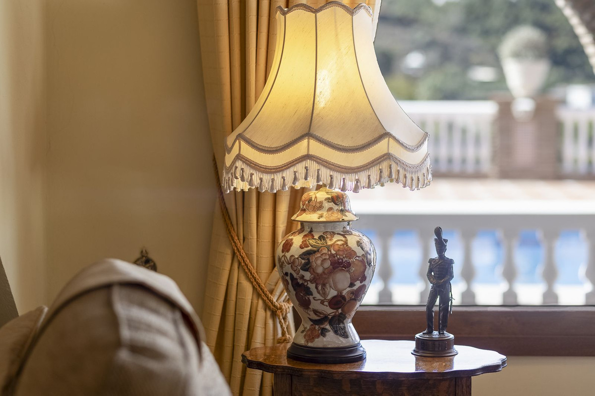 The main house features a bright and spacious living room with several arched windows overlooking the terraces, garden, and pool area.