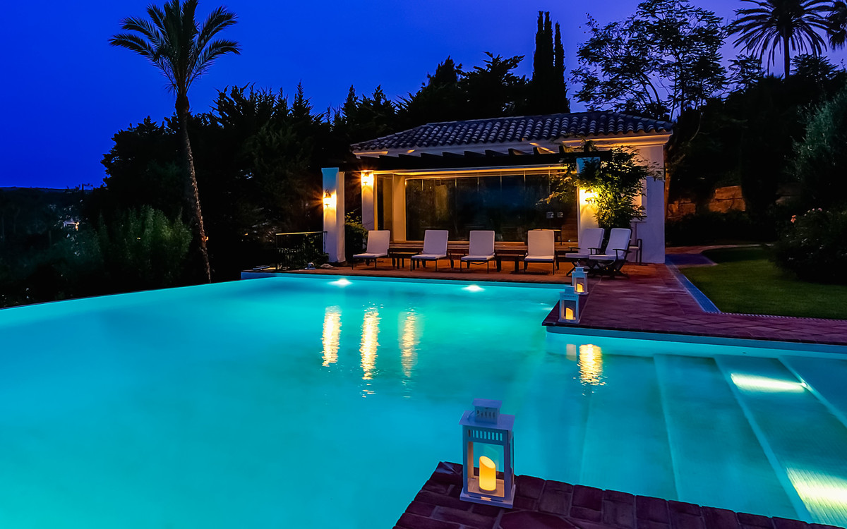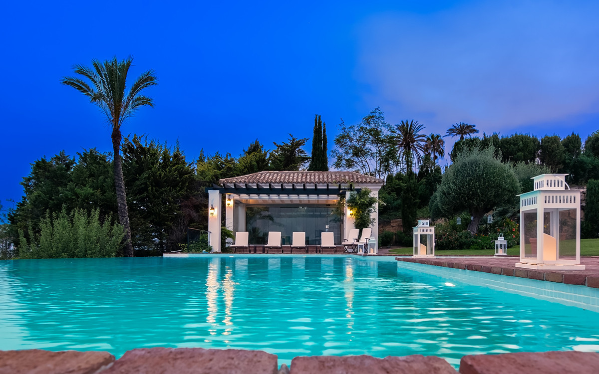 Outside there is the guest house with 2 en-suite bedrooms. In the garden area in front of the villa there is a large heated infinity edge salt-water pool and spa pavilion with covered fast lane pool which can be closed with glass curtains.