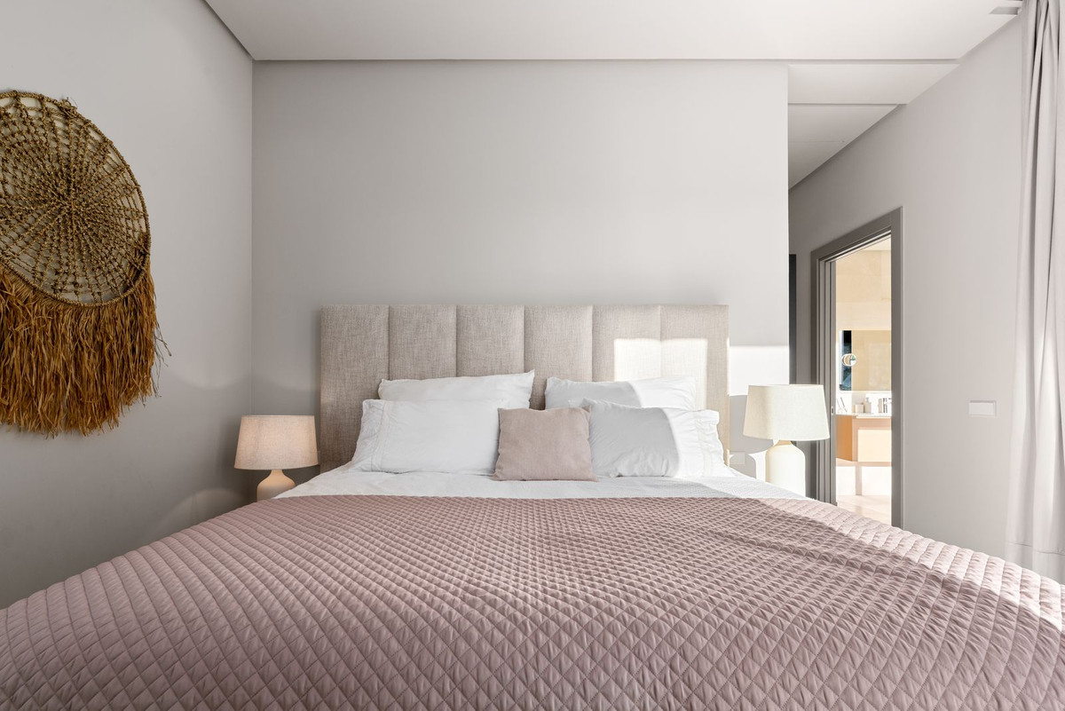 The main level is dedicated to contemporary open-plan living, framed by floor-to-ceiling windows that flood the space with natural light and seamlessly connect indoors with the surrounding landscape. Expansive sliding doors lead to a large terrace, ideal for outdoor dining for up to twelve guests while overlooking the Mediterranean. This level also includes a stylish gas fireplace, guest toilet, and a fully fitted kitchen with Silestone worktops and high-end Miele appliances, complemented by an outdoor laundry area and a charming garden.