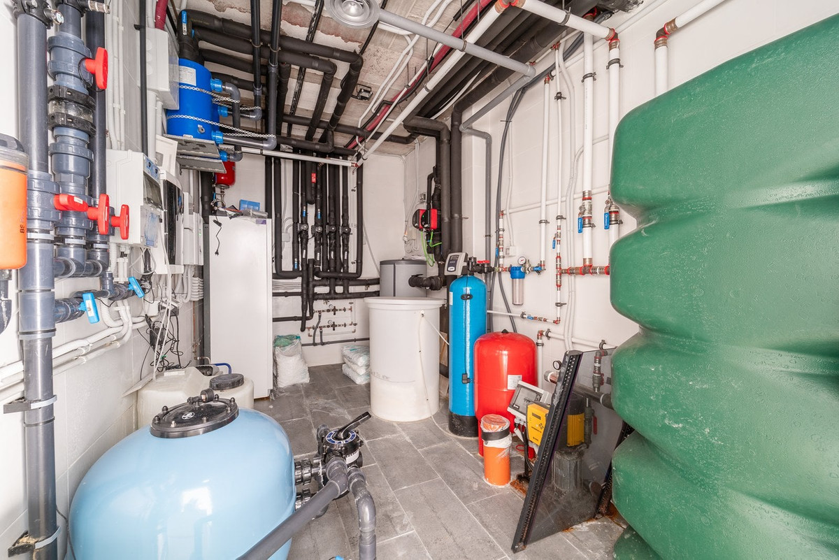 Outside, the property features a heated pool that can be used for most of the year, as well as different areas designed for relaxation and socializing. The sun terrace on the upper floor includes a large pergola, outdoor kitchen with barbecue, and a leisure area with mini golf, creating a versatile environment for family gatherings or get-togethers with friends in a relaxed and practical setting.