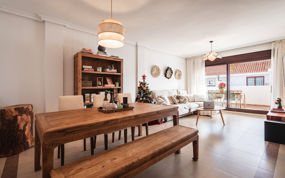This exquisitely three-bedroom apartment is ideally located in the heart of Nueva Andalucía, within easy reach of all amenities and just minutes from the beach. Situated on the first floor of a charming gated community, the property combines contemporary comfort with the timeless appeal of Andalusian-style living.