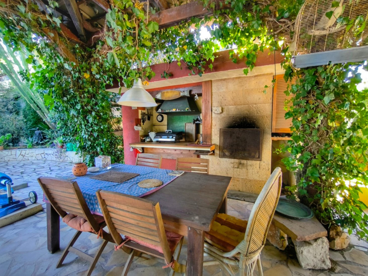 The exterior of the property is designed to make the most of the Mediterranean climate, with ample covered and uncovered terraces, a private pool, an outdoor kitchen with a barbecue, and a generous parking area including an independent garage.