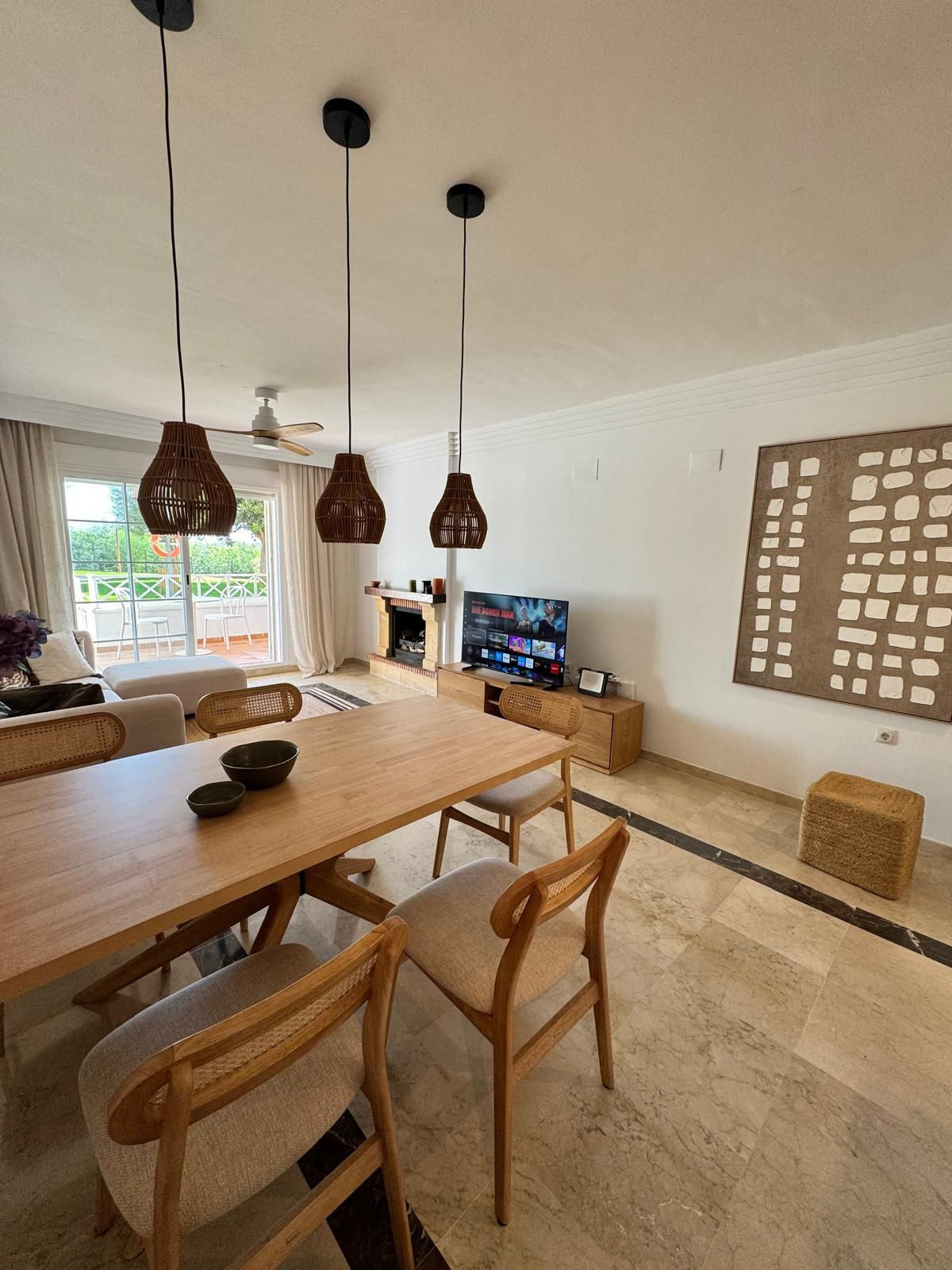 Discover this exclusive ground floor apartment, fully renovated and furnished, located in the prestigious Lomas de Río Real development, one of the most sought-after residential areas in Marbella East. Surrounded by greenery and tranquillity, just minutes from the beach and the renowned Trocadero Arena, and adjacent to Río Real Golf Club.
