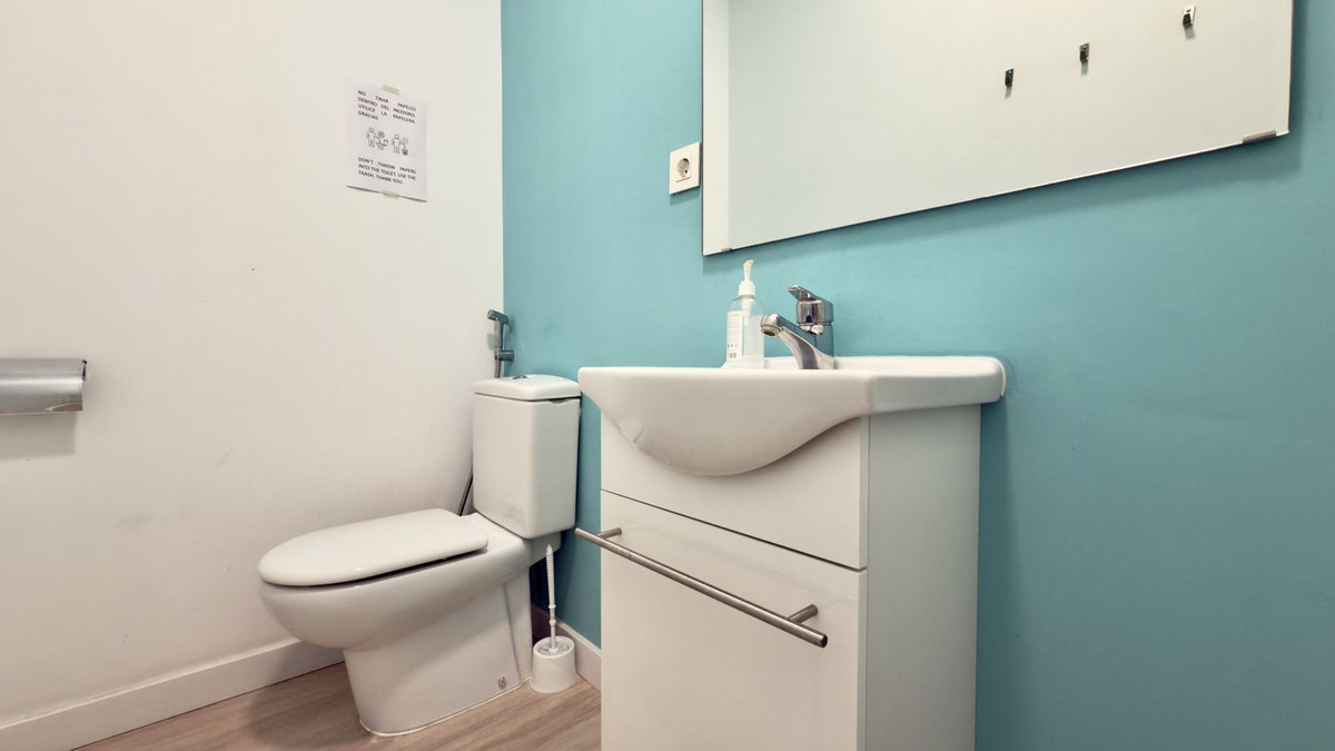 The layout includes four independent offices, a large open-plan hall ideal for reception or shared workspaces, and two bathrooms, one of which is adapted for people with reduced mobility. The premises are equipped with air conditioning, as well as water and electricity supplies, ensuring full operational comfort.