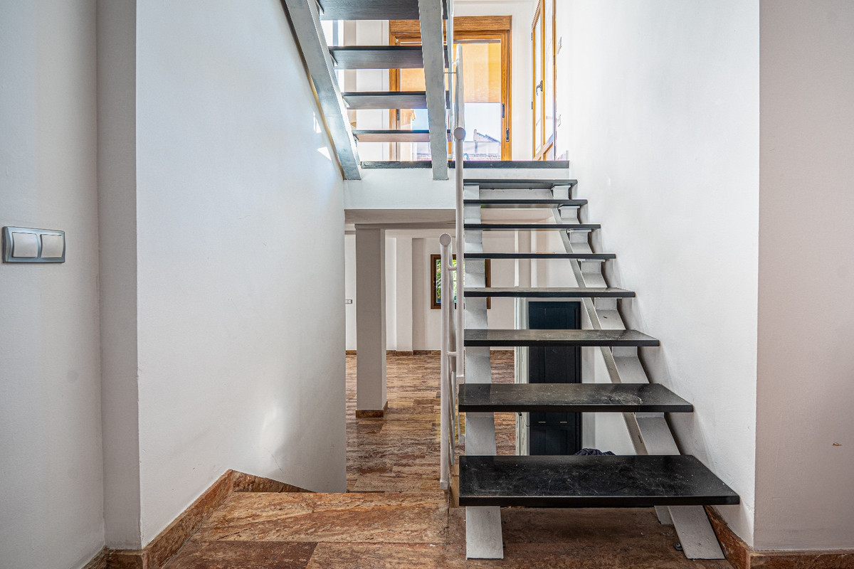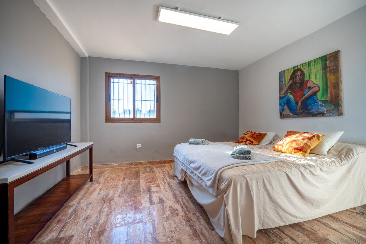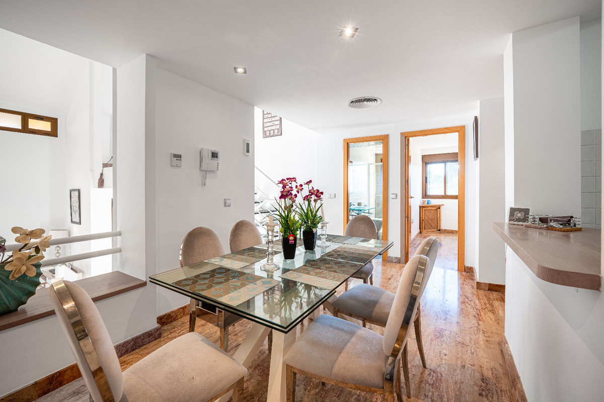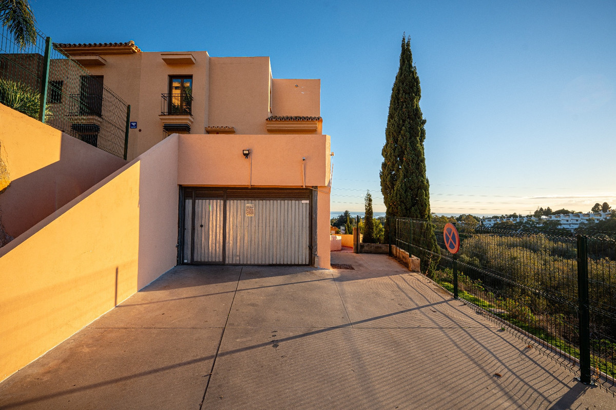 This is a south facing corner semi detached 4 bedroom house set over three spacious levels. It offers two bathrooms plus a private garden with pool and open countryside and sea views. Access is via the main entrance or through the private garage on the lower level. The garage fits one car and there is secure parking for at least three more vehicles outside.