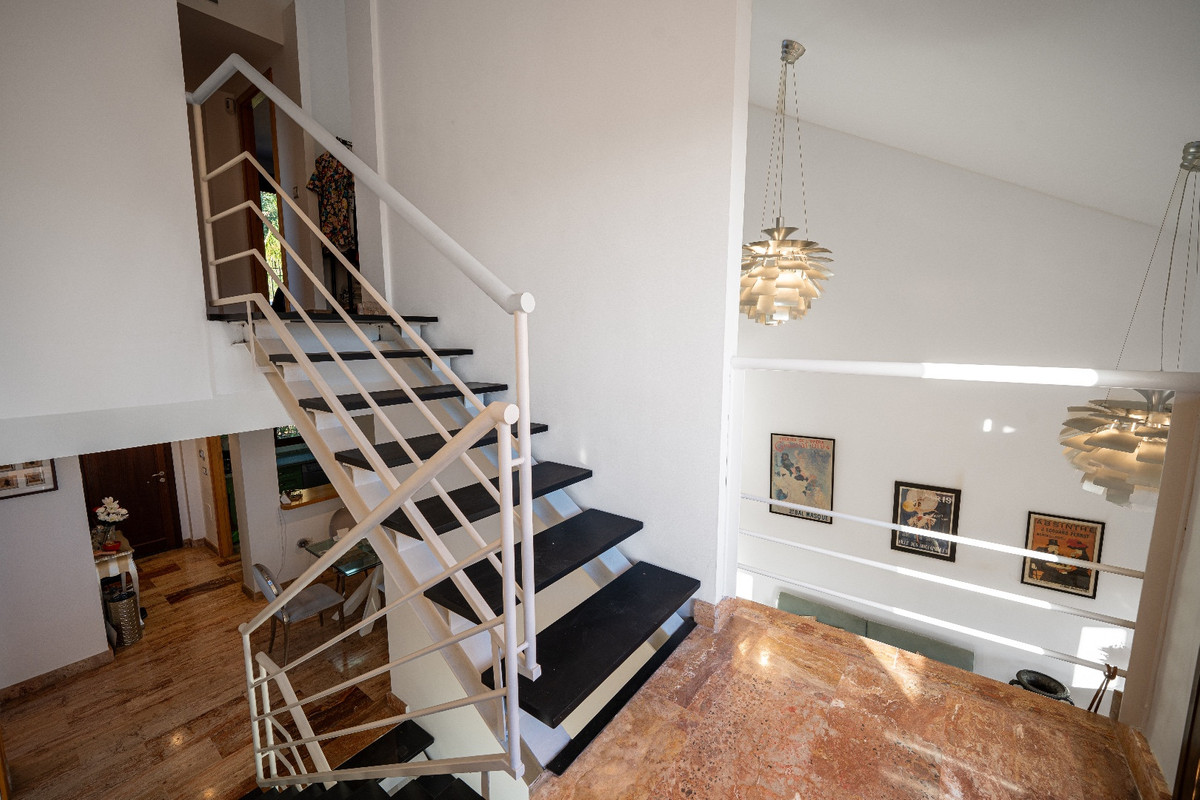 The lower level includes a guest bedroom a utility room and a large flexible space for a gym cinema or games room. The main living level features floor to ceiling glass and a dramatic double height ceiling with abundant natural light. It opens to two sunny terraces with a built in BBQ. The next level holds a fully fitted kitchen a separate dining area overlooking the lounge a further bedroom and a bright modern bathroom.