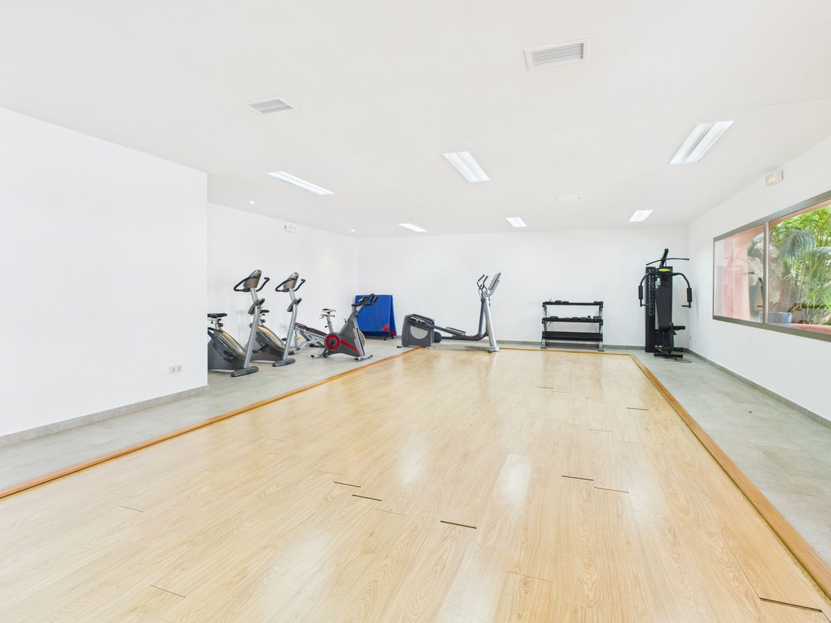 Residents benefit from immaculately maintained gardens and two large swimming pools with cascading waterfalls, creating a tranquil resort-style atmosphere. The community also features two fully equipped gyms, saunas, and extensive communal facilities.