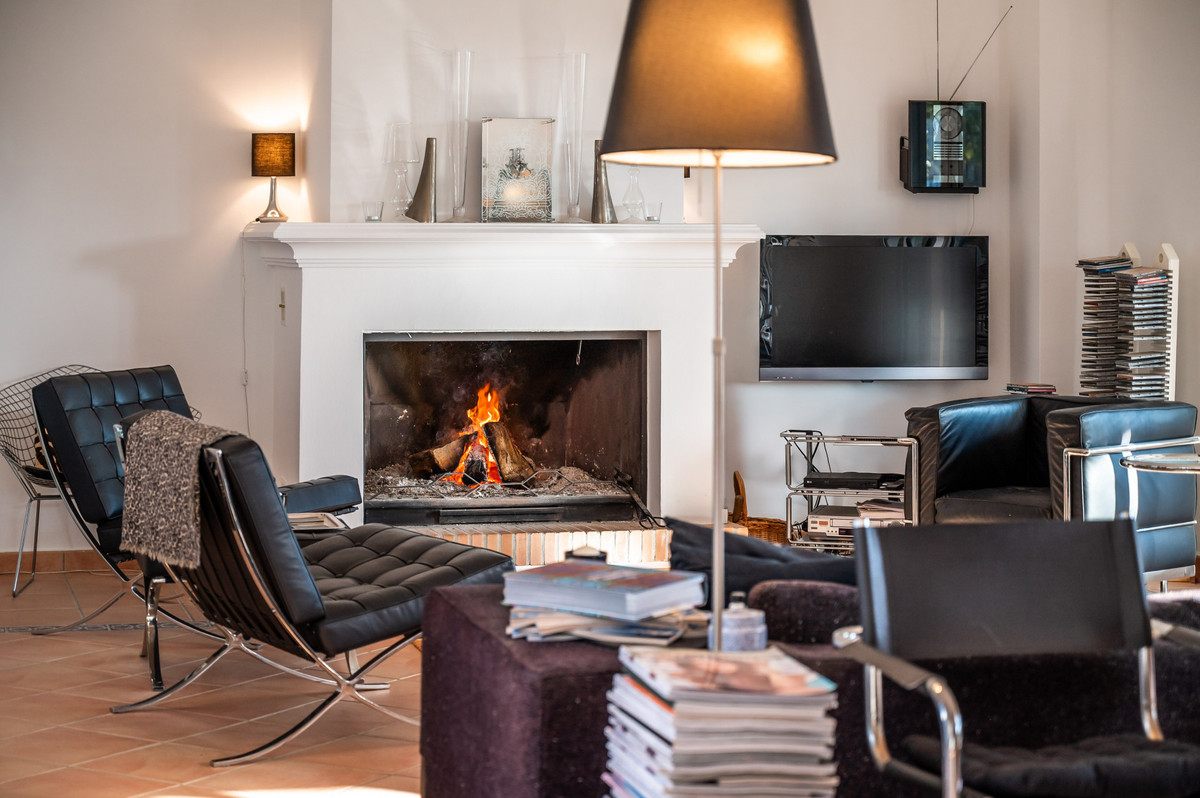 Following the courtyard to the left, one of the ensuite bedrooms is currently used as a music room, featuring a distinctive yellow piano that adds personality and warmth. Continuing straight ahead, the main living room opens up beautifully, styled with designer furniture and centred around a striking fireplace. One side of the room flows naturally into a library area, with an entire wall dedicated to books and magazines, creating a calm and inviting atmosphere.