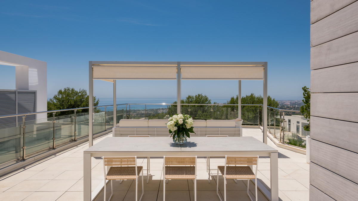 This luxurious modern house for sale in the heart of the Sierra Blanca is set in the most exclusive residential complex, Meisho Hills, built on a plot of 33.500m2 in 2012. The complex has a total of 58 semi-detached villas, including this unique corner villa, which boasts stunning views of Marbella city, the Mediterranean sea, Gibraltar, and the Moroccan mountain range.