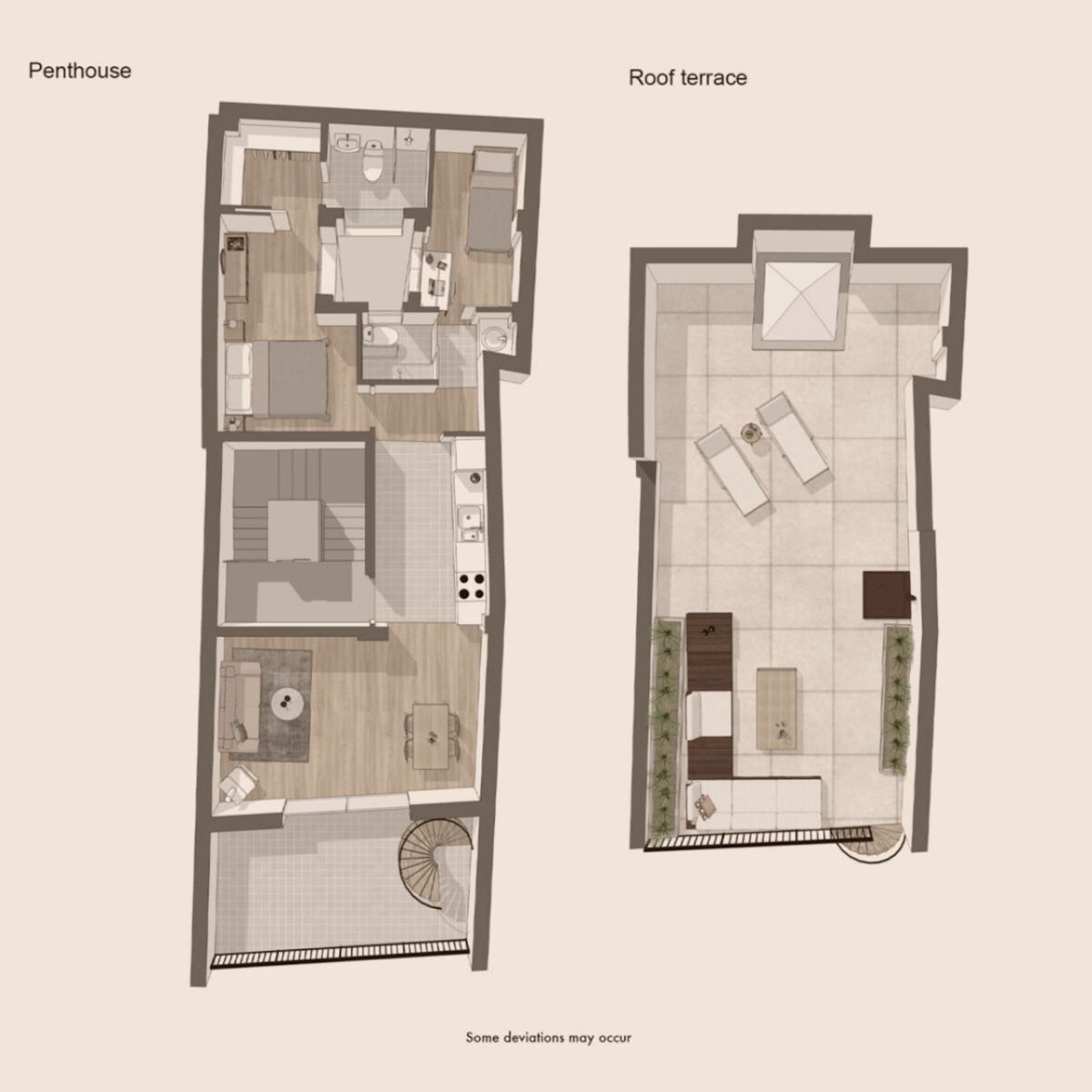 This extraordinary penthouse apartment boasts an incredibly efficient layout and stands out in every aspect, featuring a spacious terrace facing the street anda unique roof terrace .
