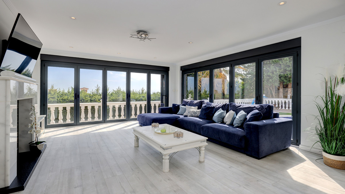 The bright and airy living area opens onto an extended conservatory-style terrace that captures sunlight from sunrise to sunset. It's the perfect space to relax, dine al fresco, or entertain year-round while enjoying the views and natural light.