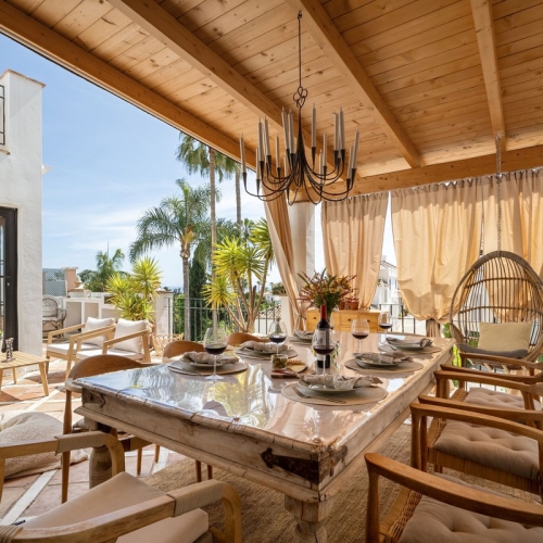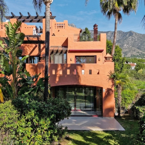 Casa Altavista is a south east facing luxury townhouse for sale with panoramic mountain sea and coastal views. It offers three bedrooms and three ensuite bathrooms within 172 m2 built. The modern spacious kitchen has a view and direct access to the internal patio. Open plan living and dining areas lead to the main terrace with a gate to a small private garden. The home includes air conditioning central heating a wood burning fireplace two private parking spaces and a storage room.