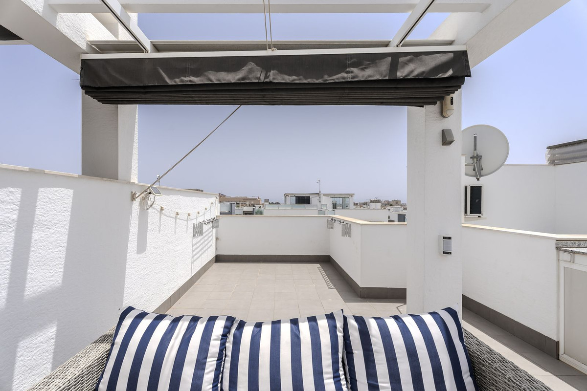 The apartment features two spacious bedrooms with fitted wardrobes and two fully tiled bathrooms, including one ensuite. The open-plan kitchen and living area create a bright, airy atmosphere and open directly onto a charming balcony. Upstairs, you will find a private roof terrace of approximately 58 m², complete with an outdoor kitchen, pergola, and ample space for sun loungers, dining, and relaxing under the Spanish sun. From the terrace, enjoy views of the surrounding area and glimpses of the Mediterranean Sea.