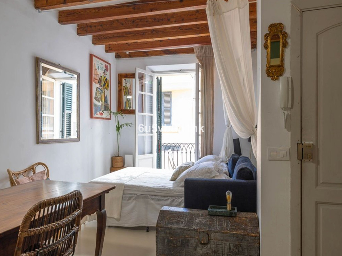 This vibrant, renovated artistic studio is situated in the very heart of Palma's Old Town, just steps away from the lively Plaza Mayor. With a total surface of 33 m², it combines living, kitchen, dining, and sleeping zones in one thoughtfully designed space featuring original exposed ceiling beams and a charming stone staircase.