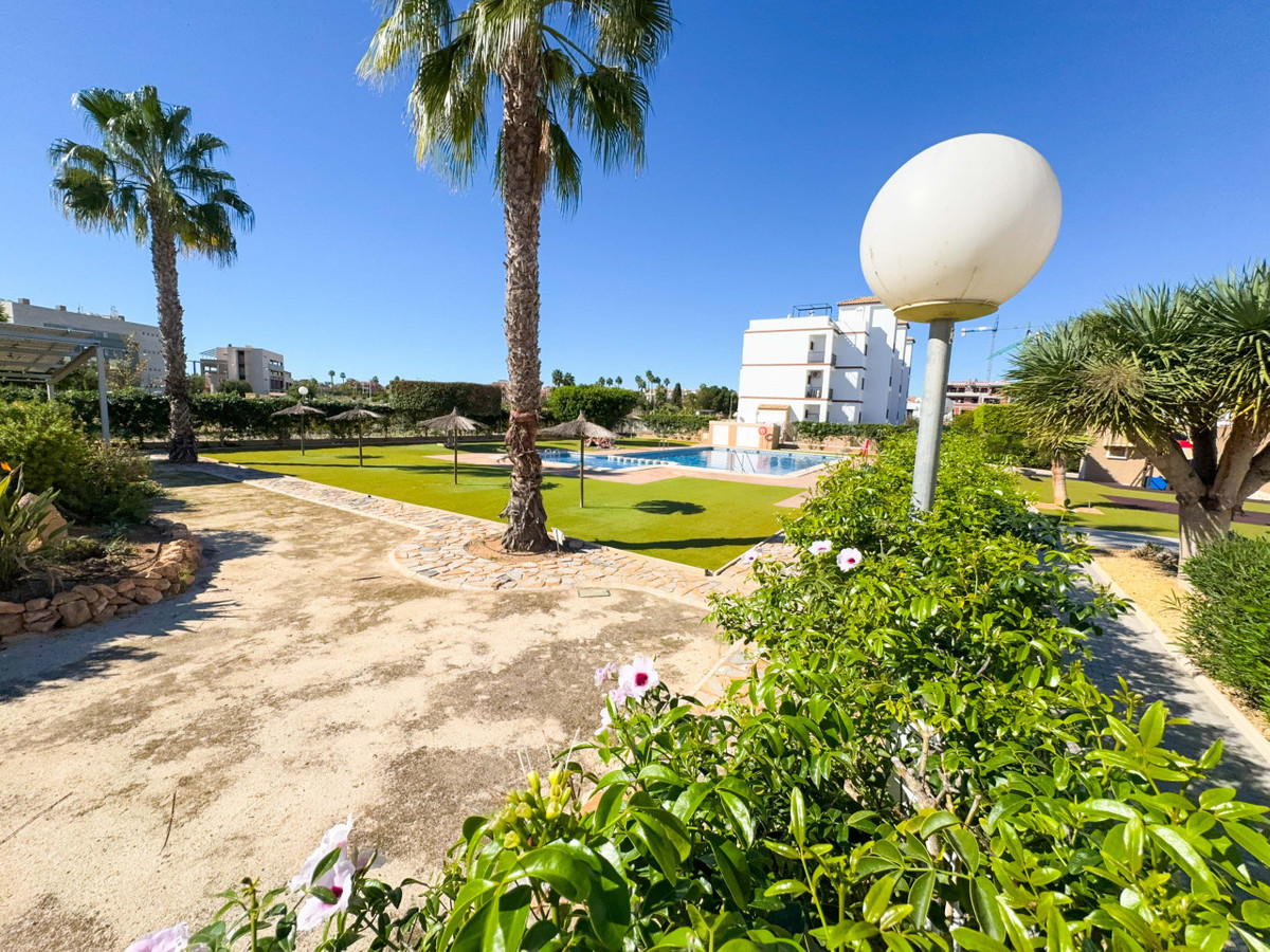 Ground floor apartment in Punta Prima, Orihuela Costa, featuring a private garden, communal pool, and covered parking space. The property offers a spacious living-dining room with access to a 16 m² patio and approximately 51 m² garden, with a private door leading directly to the swimming pool area. The American-style kitchen is integrated and modern. It includes two bedrooms with built-in wardrobes and two full bathrooms providing comfort and space. The sale includes a covered private parking space, perfect for vehicle security. Located in a quiet and attractive area of Orihuela Costa, close to services and leisure areas. This apartment is ideal for those seeking a home with direct pool access and ample outdoor spaces. We recommend scheduling a face-to-face or virtual visit to explore all details. Additionally, it offers investment potential with seasonal rental services. Contact us to arrange a visit and seize this excellent real estate opportunity.