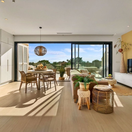 This beautifully designed three-bedroom, two-bathroom apartment is located in the prestigious Madroño community, one of the most sought-after enclaves within Las Colinas Golf & Country Club. Positioned to take full advantage of its elevated setting, the apartment offers sweeping views across the golf course, the surrounding hills and greenery, and on clear days, even a glimpse of the Mediterranean Sea in the distance. The property is part of a low-density development where design and space have been prioritised. The primary bedroom features a luxurious en-suite bathroom, while the two additional bedrooms share a second full bathroom. The open-plan living, kitchen, and dining area is zoned with intelligent design, including an integrated dining table built into the kitchen island — perfect for both everyday living and entertaining. The interiors combine contemporary elegance with natural warmth. Earthy tones, wood-panelled feature walls, designer lighting, and high-end materials create a sophisticated yet welcoming feel throughout. Lighting details have been meticulously considered, with soft illumination from integrated fixtures, including along the skirting boards, enhancing the apartment's unique and high-quality finish. A standout feature is the generous outdoor space. Two large terraces extend the living area and invite you to enjoy the peaceful surroundings, morning sun, or evening breezes — ideal for dining alfresco or simply relaxing in privacy. Included in the price is an underground parking space and a private storage room. Residents of Madroño enjoy access to beautifully landscaped communal areas, a large swimming pool, and a modern gym — all designed to complement the natural setting.