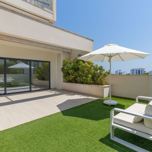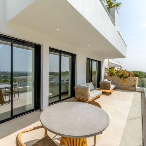 2 bedroom Hinojo apartment in Las Colinas Golf~If you dream of a luxury home on Las Colinas Golf and Country Club in the most favorable climate of Spain, we offer you this furnished dream apartment in Community Hinojo 1 on the second floor. When you enter here, you are welcomed by a warm and cozy ambiance. This south facing apartment is lovingly furnished and decorated in Ibiza Style. The living room has three large windows across the entire width, all of which can be slid open so that the terrace with the same tiled floor becomes an extension of the living room. From this terrace with cozy lounge set, you can enjoy a magnificent view with lots of greenery (forest), sea and the Mar Menor with the Manga. The kitchen is equipped with luxury Bosch appliances and can be completely closed off to a wide white wall.~There are two bedrooms with large fitted wardrobes and extra storage space under the beds.~The Master bedroom has a luxurious bathroom en suite, the second bedroom also has its own separate bathroom.~The apartment includes underground parking and private storage room. Major advantages of this apartment are: Fully furnished~South facing terrace~Very well and cleanly maintained~As new; no damage or defects~Fantastic view~Fully situated on the sunny South~The terrace is enclosed with glass walls so that you also have a full view while sitting~Air conditioning in all rooms~Filtered drinking water~Washing machine / dryer available in the outdoor cupboard Las Colinas Golf & Country Club~A World Apart! Las Colinas Golf & Country Club is one of the most prestigious resorts on the Costa Blanca! It is an exclusive and unique 330 hectare golf resort with many sports facilities including golf, padel, hiking, fitness, yoga and much more. It is A World Apart where you can enjoy a healthy Mediterranean lifestyle. With an exceptional climate and first class services, the resort has been recognised as "Spain's and Europe's Leading Villa Resort" by the World Travel Awards in recent years. Nestled among the hills of the Dehesa de Campoamor – on the Mediterranean coast south of Alicante – Las Colinas Golf & Country Club is a unique natural area that has been carefully preserved and where exclusive homes have been integrated into the surroundings where you can relax and enjoy the scenery. This resort, with some excellent restaurants and the Wow Beach by Las Colinas has an international reputation and is well known and sought after by celebrities. Find your dream home today by taking a look at the most beautiful and exclusive homes we have to offer!